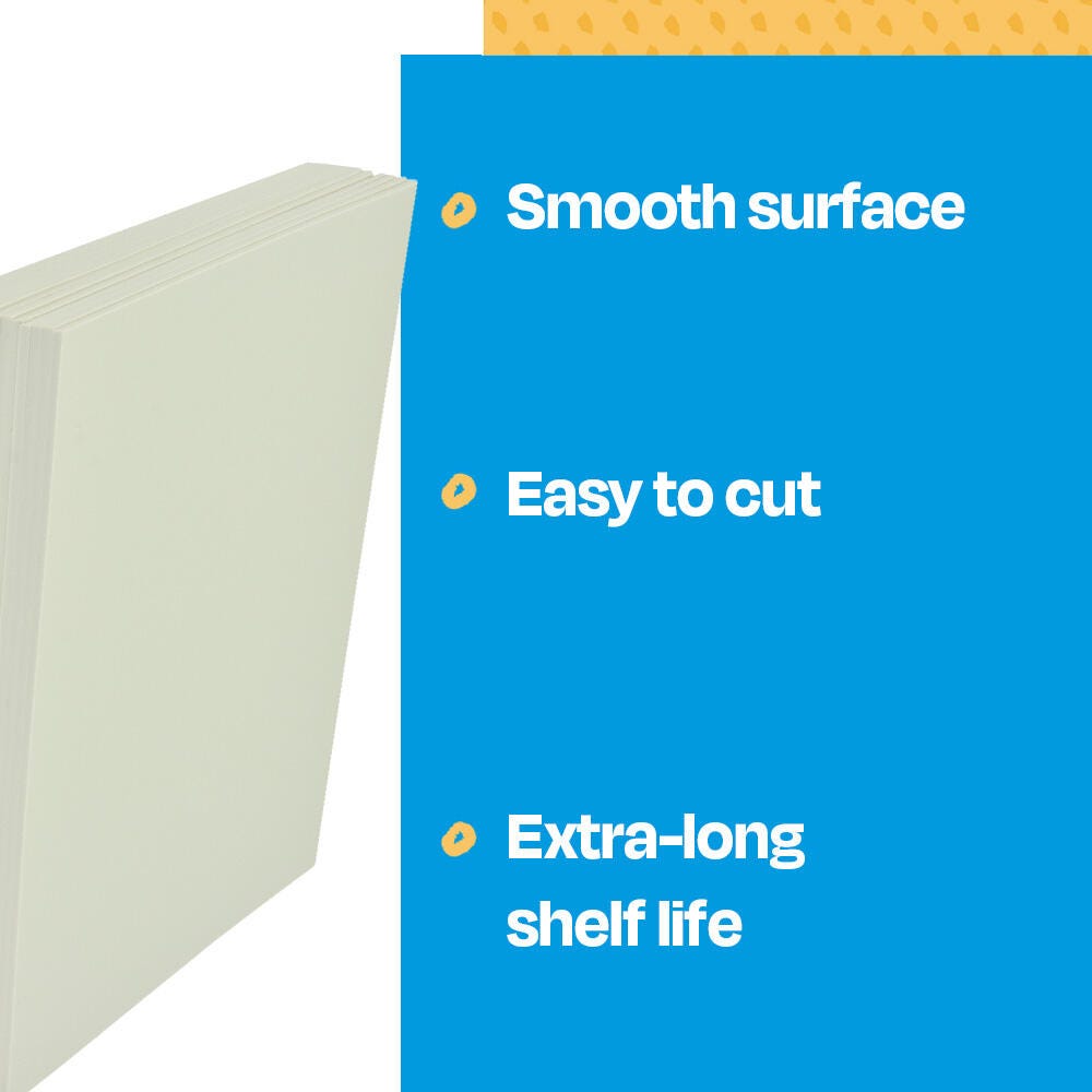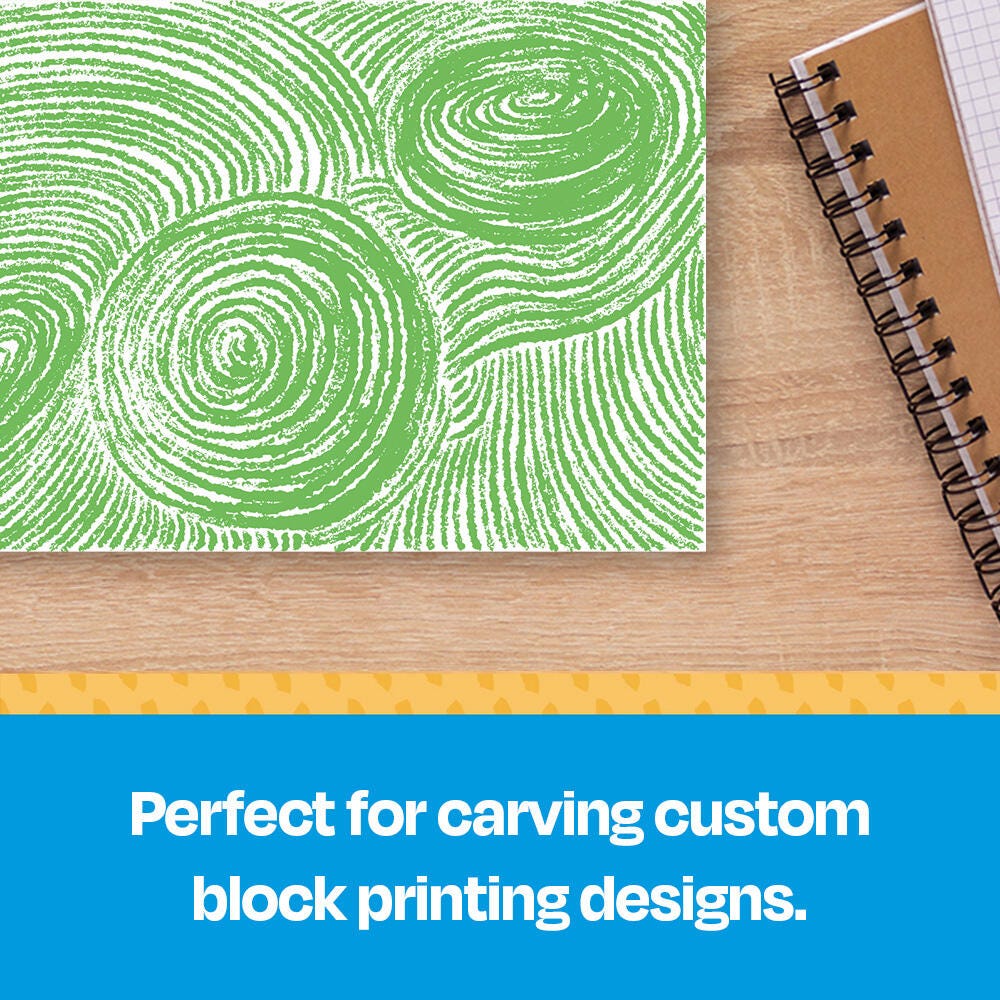 Sax 9 x 12 inch unmounted linoleum blocks feature a synthetic surface with a velvety smooth finish that cuts easily using traditional linoleum tools. The lino print leaves crisp, clean edges, works well for fine lines and detailed cuts, and is soft enough to be cut into different shapes with scissors. It has an extra-long shelf life and will not become brittle. Use the linocut sheet for carving or block printing. It’s carvable on both sides and is an economical choice for teachers and students for use in schools, studios, and homes.