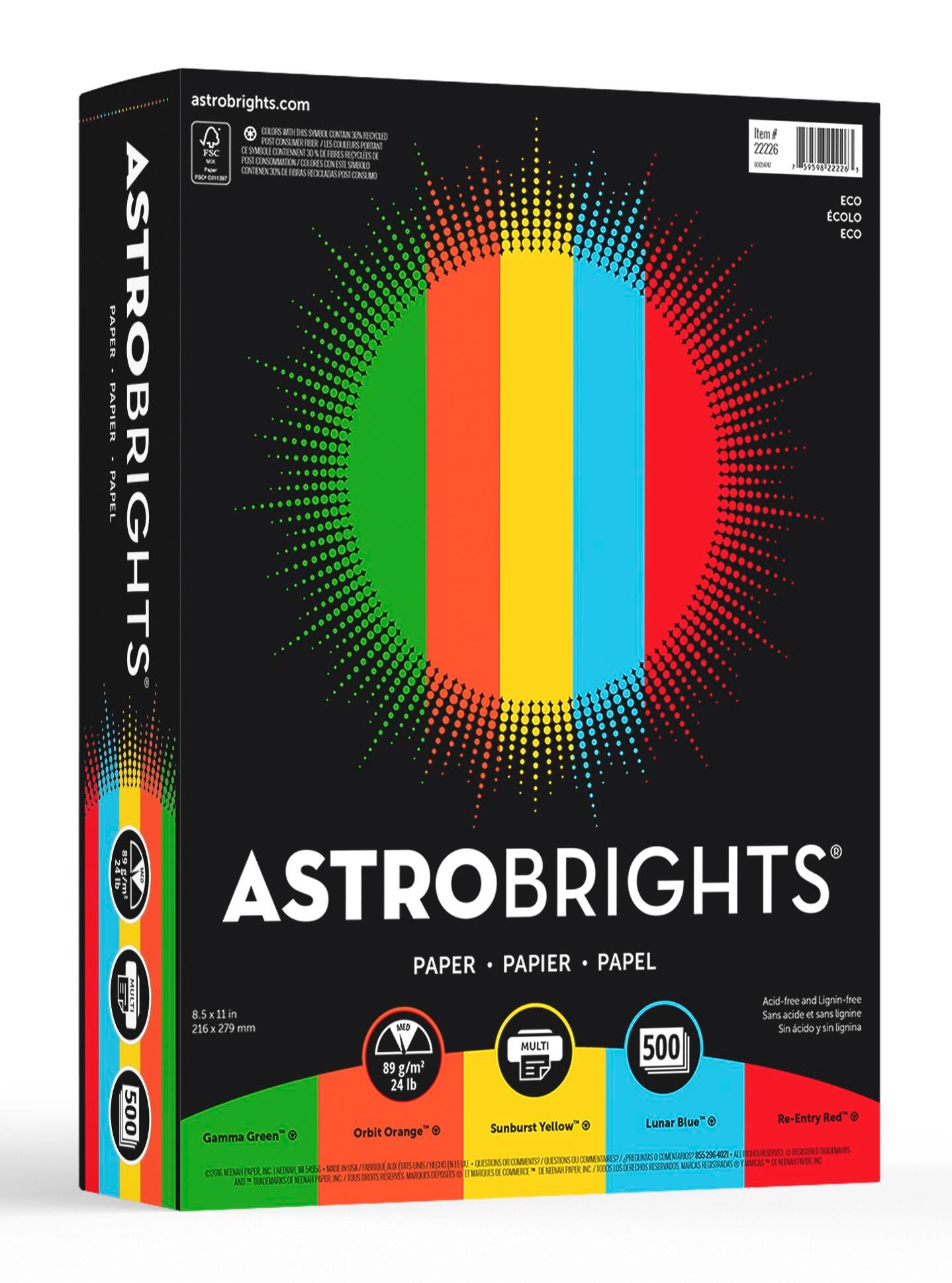 Create brilliantly bright flyers, school projects, coupons, crafts and beyond with Astrobrights Eco Assorted Paper. Suitable for laser, inkjet and copier with 24 lb. basis paper weight, each sheet (measuring 8-1/2 x 11 inches) of envionmentally friendly colored paper is 20 percent thicker than standard colored paper for bleed-free and easy double-sided printing.Features