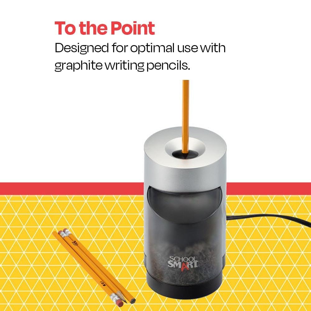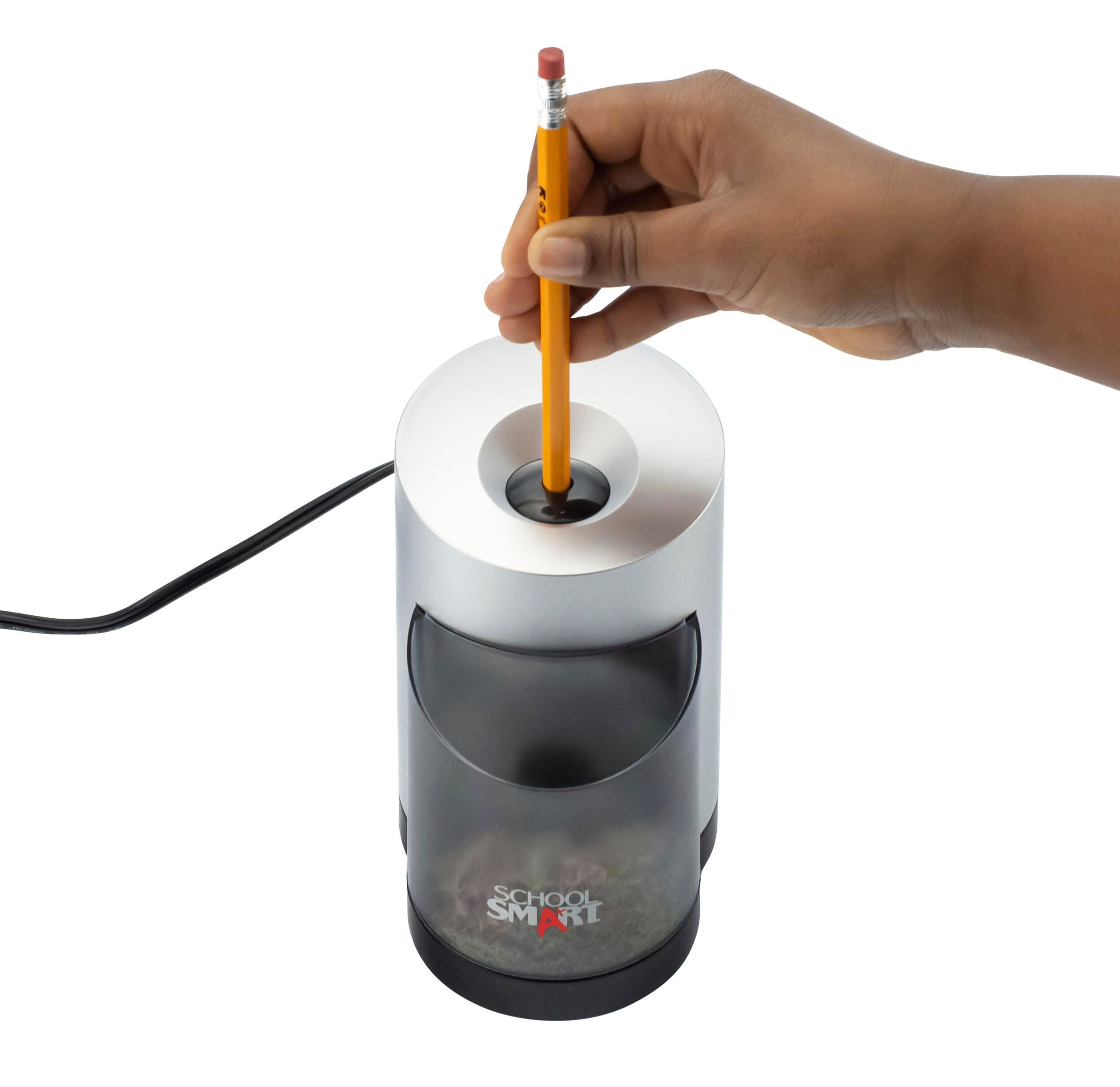 If you’re looking for a non-traditional pencil sharpener, this contemporary (and quick) design may be for you. The School Smart single-hole vertical electric pencil sharpener has a heavy-duty motor with a helical steel blade and an auto pencil stop to help ensure a perfect tip each time. Get a sharp pencil in around 2 seconds of insertion! Non-skid rubber pads at the bottom promote stable operation, and the easy-to-empty shaving container immediately stops the machine when removed. The total size is 6 L x 4 W inches. For sharpening colored pencils, we recommend the School Smart Dual-Hole Pencil Sharpener (Item #2136471).