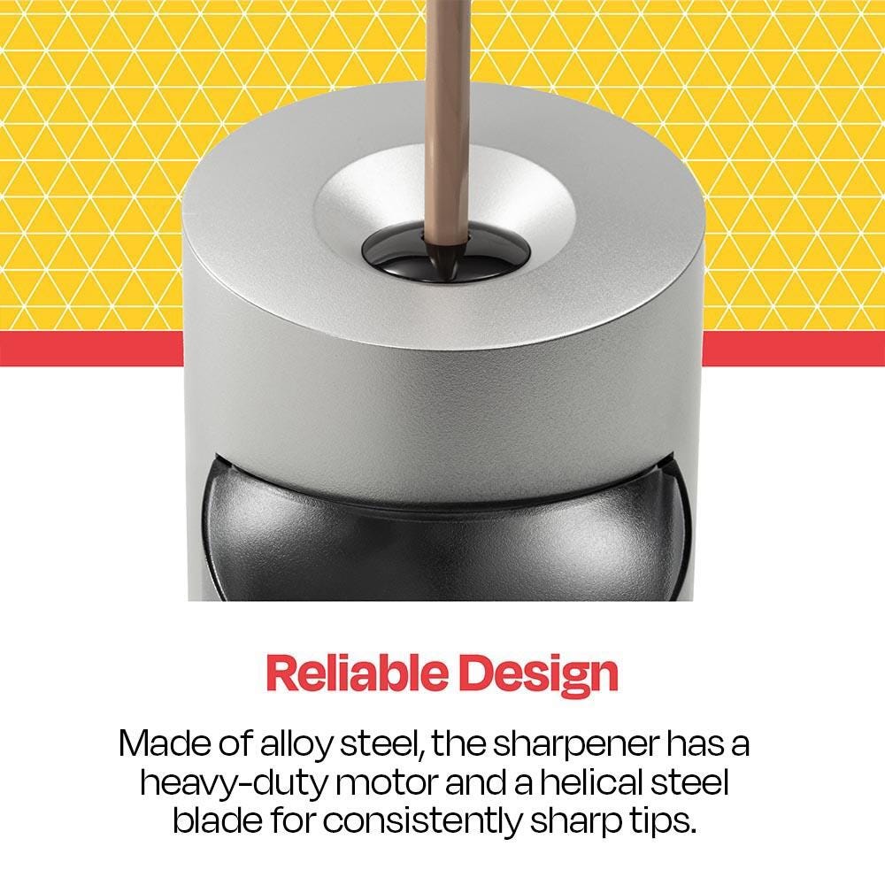 The corded pencil cutter’s helical steel blades and auto-stop mechanism create sharp pencil tips without overcutting