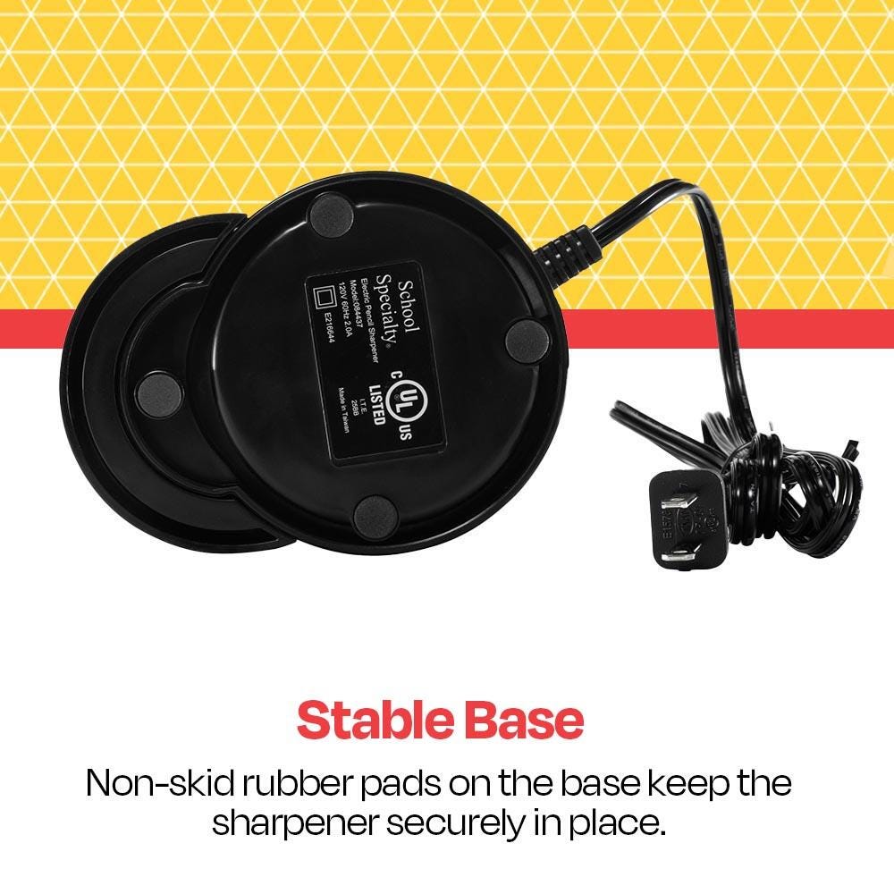 The non-skid rubber suction bottom helps keep the classroom electric pencil sharpener secure on tables and desktops