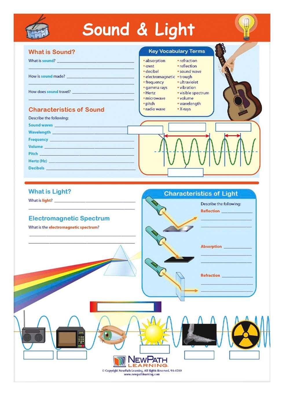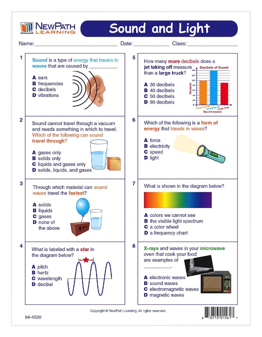 Complete, easy-to-use and engaging, the Sound & Light Learning Center is ideal for the instruction and review of this key, standards-based concept. Designed for either teacher-directed instruction or independent use by groups of 2 to 4 students, the Learning Center provides complete, leveled coverage of this curriculum-aligned topic, making it perfect for differentiated instruction. To use, the students first work individually or in pairs using the 4 laminated Visual Learning Guides provided on the topic. The guide provides a graphic, easy-to-follow overview of the concept; “Write-On/Wipe-Off” activities and graphic organizers; and a set of guiding, assessment review questions. They then form in a group to play the Curriculum Mastery Game included for cooperative or competitive review and reinforcement of the concepts. Packaged in a durable pouch, the Learning Center is a ready-to-use resource for the classroom, after school and summer school programs or at home for test preparation, practice and review! Grades 3 - 5.Features