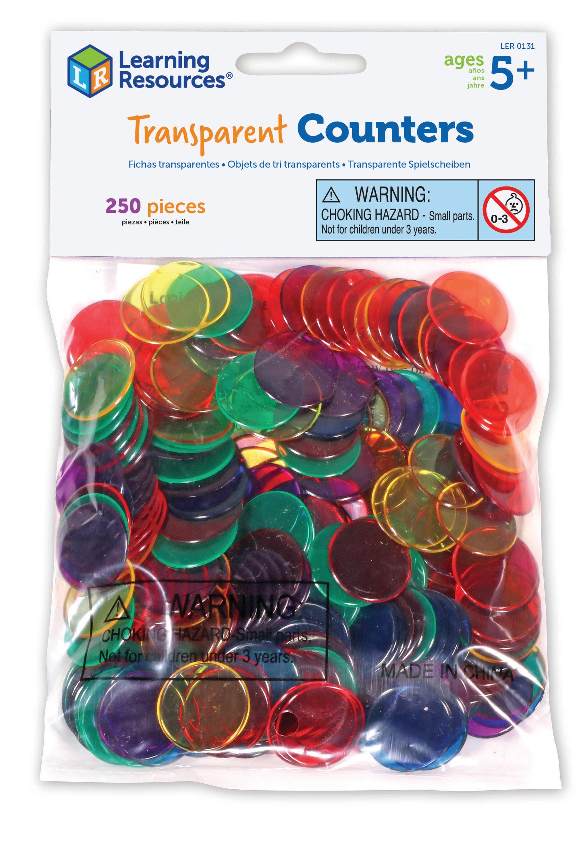 These colorful Learning Resources Transparent Counters are great for teaching counting, probability, and more! Set of 250 counters come in 6 colors and measure 3/4 inches in diameter. Ages 5 and up.