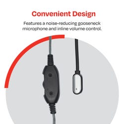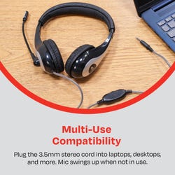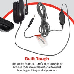 Califone NeoTech 1025MT On-Ear Stereo Headset with Gooseneck Microphone is convenient, comfortable, and durable. Made with an adjustable, rugged, and padded headband for extended wear, the headphones have noise-reducing earcups to help cancel outside interference. The unidirectional gooseneck microphone is flexible for easy adjustment and has noise-reducing capabilities to capture clear speech. Changing the sound level is easy with an inline volume control located on the cable. Made for all ages, the highly durable CaliTuff cord is made of braided, PVC-jacketed material with a reinforced earcup entry point. It resists bending, cutting, and separation due to heavy use, chewing, or rough play. The long 6-foot cord has a 3.5mm stereo plug and is compatible with tablets, smartphones, Chromebooks, laptops, desktops, PCs, and Macs. This wired headphone is backed by a 3-year warranty.Features