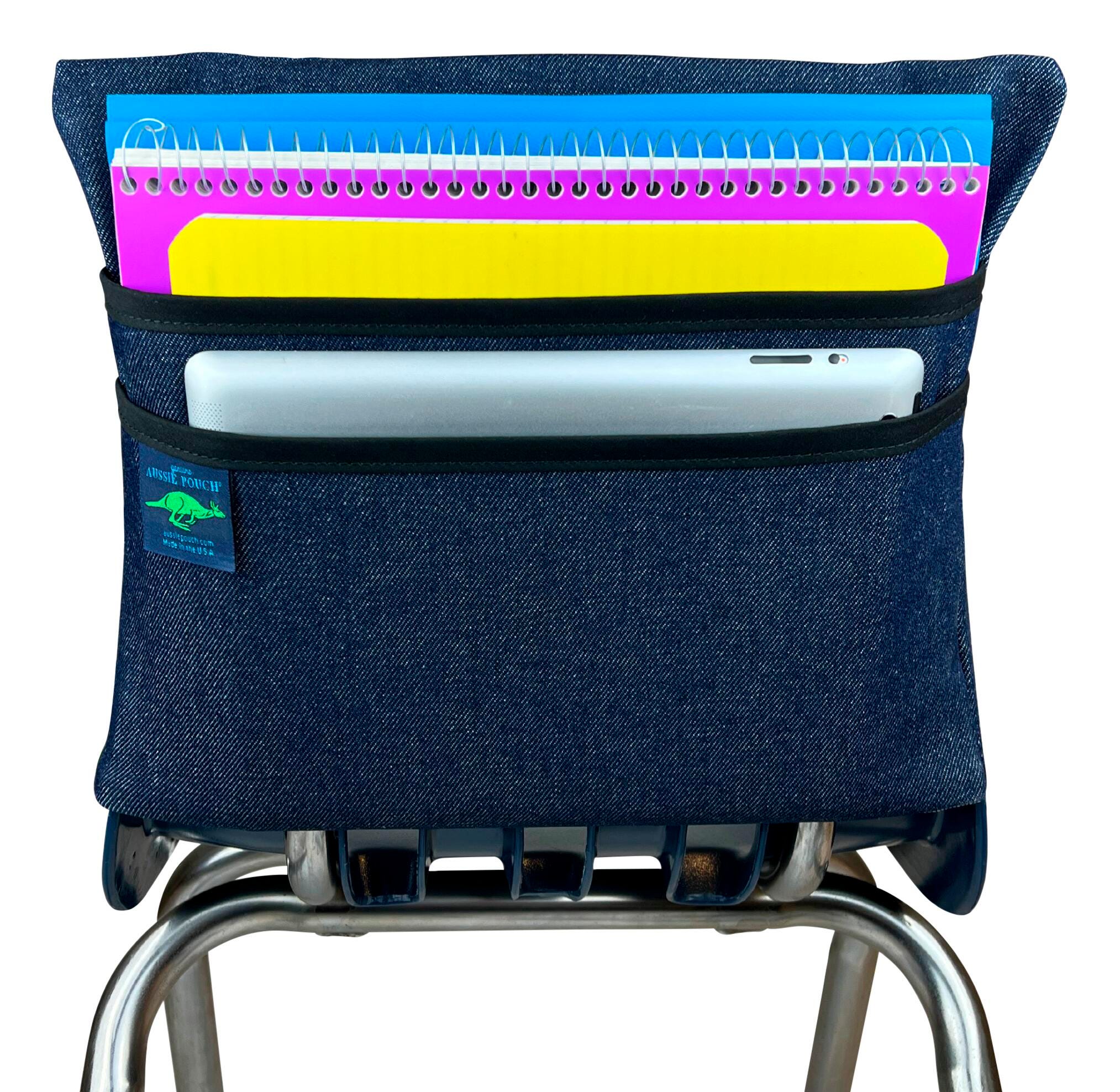 Say goodbye to overstuffed desk drawers and covered desktops! Aussie Pouch school chair pockets take the load off by neatly compiling classroom supplies right at the back of children’s seats. These premier quality pockets are manufactured with heavy weight denim that is machine washable and lasts up to 10 years! Two large pockets (with solid black piping trim) hold a variety of school supplies, notebooks, books, and smaller essentials like tape, rulers, pens, and beyond. The Medium sized pouch pocket (at 15 inches) fits chairs with a backrest with top measuring 12 to 14 inches wide and a bottom measuring 12 to 14 inches wide.