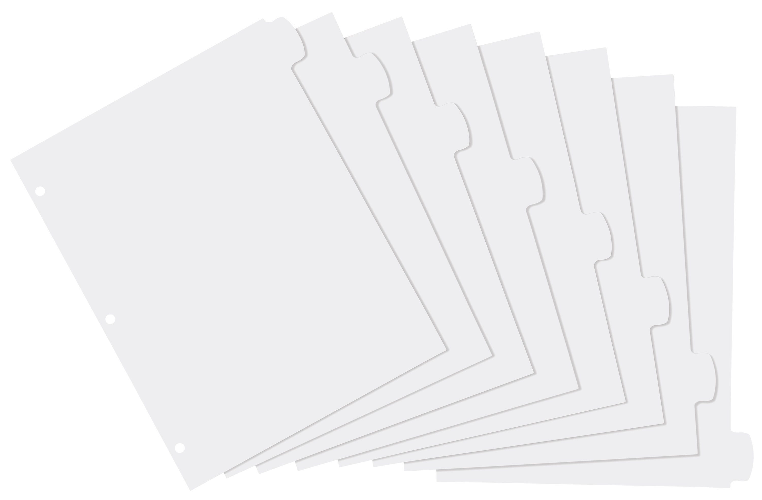 - Three-hole punched file dividers are ready to be inserted into binders, prong folders, and more