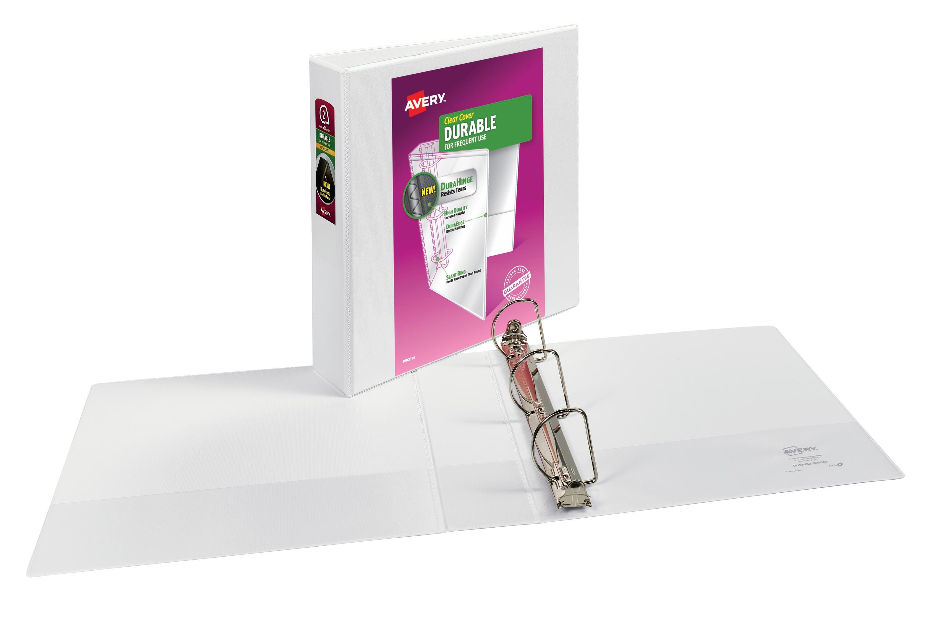Avery Durable View Slant Ring Binders feature durable construction that is ideal for frequent referencing. DuraHinge design is stronger, lasts longer and resists tearing. DuraEdge feature makes the sides and top more pliable to resist splitting. Deep texture film offers a smoother finish and features a linen pattern for high quality look and feel. Wider front and back binder panels fully cover standard dividers and sheet protectors. Organize and secure paper with two interior pockets. Slant rings have a higher page capacity compared to same size round rings. Clear cover and spine for easy customization. Pages lie flat with back-mounted rings; exposed rivets on back. Holds 8-1/2 x 11 inch documents. Front insert and spine label included. 36% minimum post-consumer content.Features