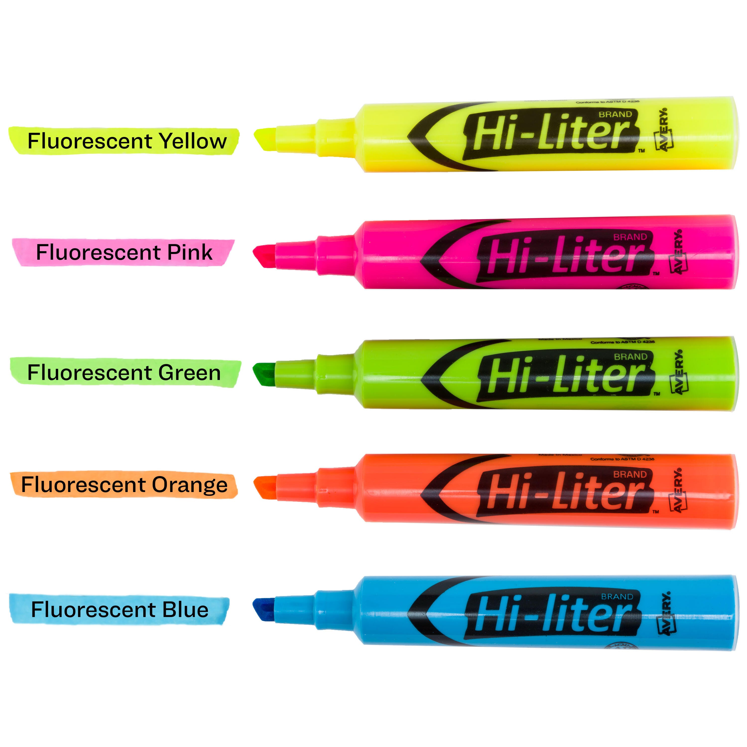 Call out bright ideas with this HI-LITER set that lets you mark key words and phrases with brilliant fluorescent, nontoxic colors. The molded chisel tip lets you highlight or underline, and the plastic tip won't fray or mush. A faceted barrel provides a comfortable grip, so you can easily use the highlighter as you mark documents, notes, books and more. The improved formula means you can leave the cap off for up to a week and still highlight with ease.