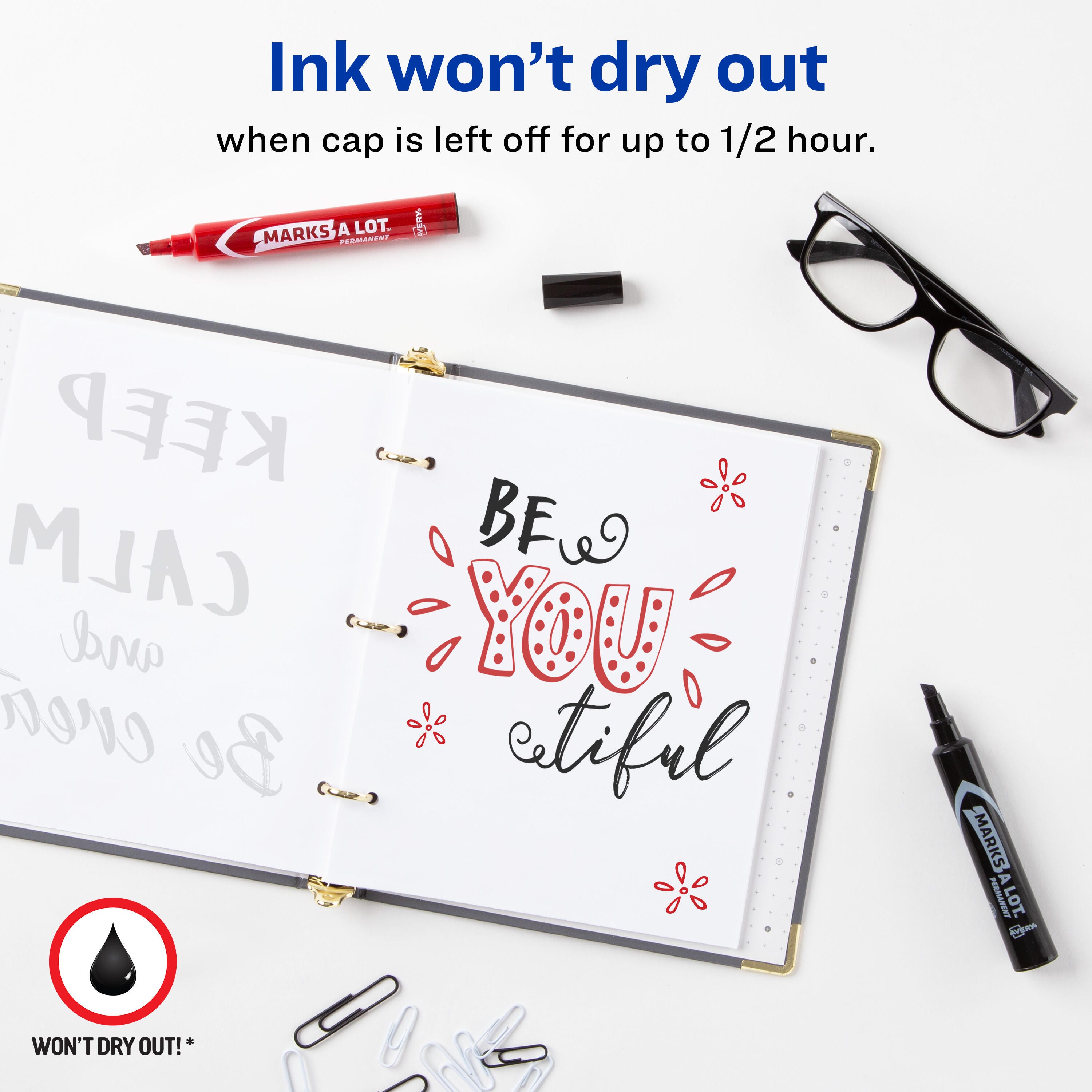 Avery Marks-A-Lot Permanent Markers have 3/16 in chisel tip to mark in a variety of line widths. Markers for office, school or home use permanent ink that is quick drying, water and rub resistant. Bold, low-odor ink offers high visibility from a distance on most surfaces including cardboard, plastic and metal. Black. Markers conform to ASTM D4236 and have ACMI certification to meet Federal standards of non-toxicity. Sold as 24 per pack.