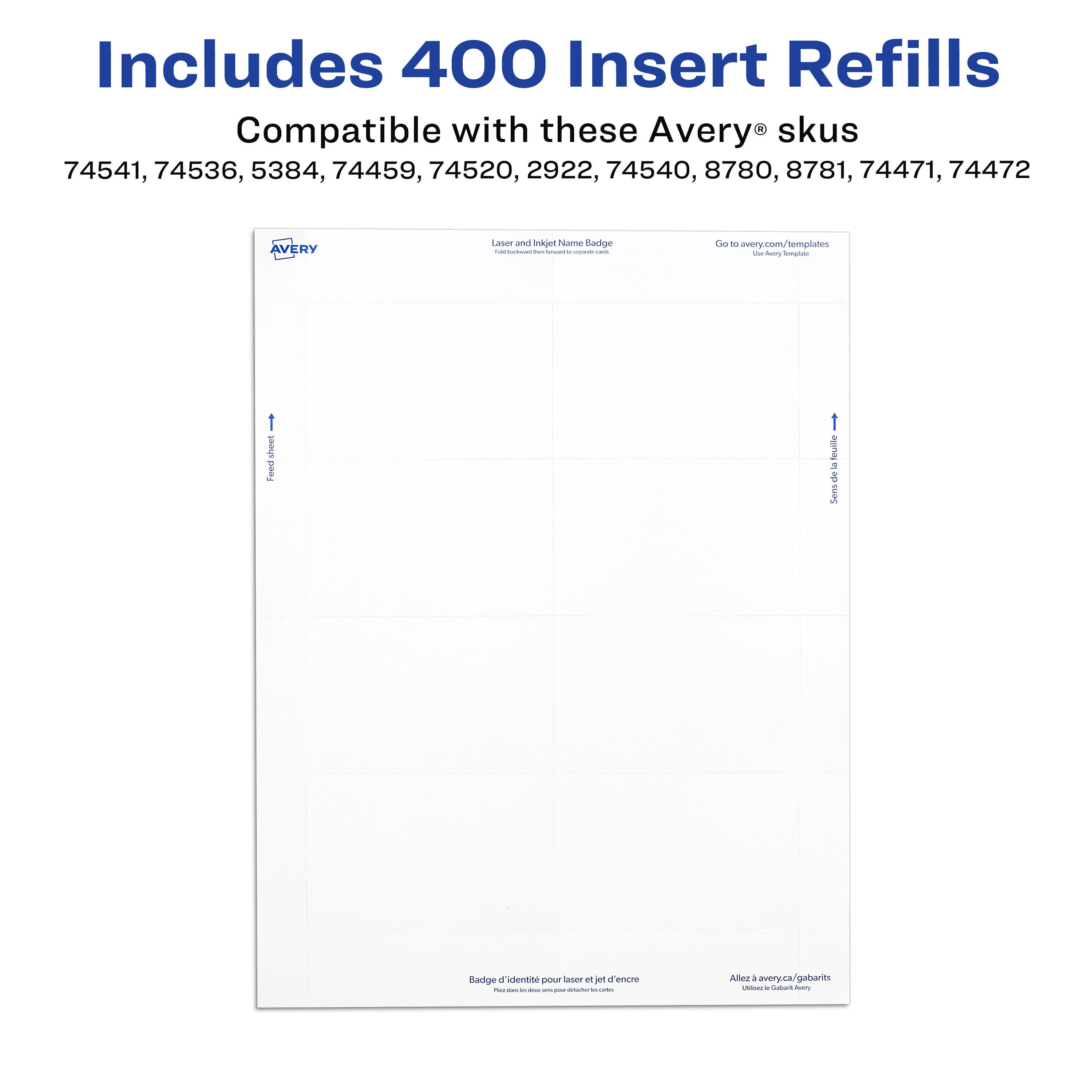 Refill resupplies Avery Name Badge Kits so you can make more professional-looking name badges with inkjet or laser printers. Ideal for meetings, seminars, special events, conventions and more. Each sheet is microperforated to tear cleanly, leaving smooth edges. Avery offers many easy-to-use templates for Microsoft Word and other popular software programs.