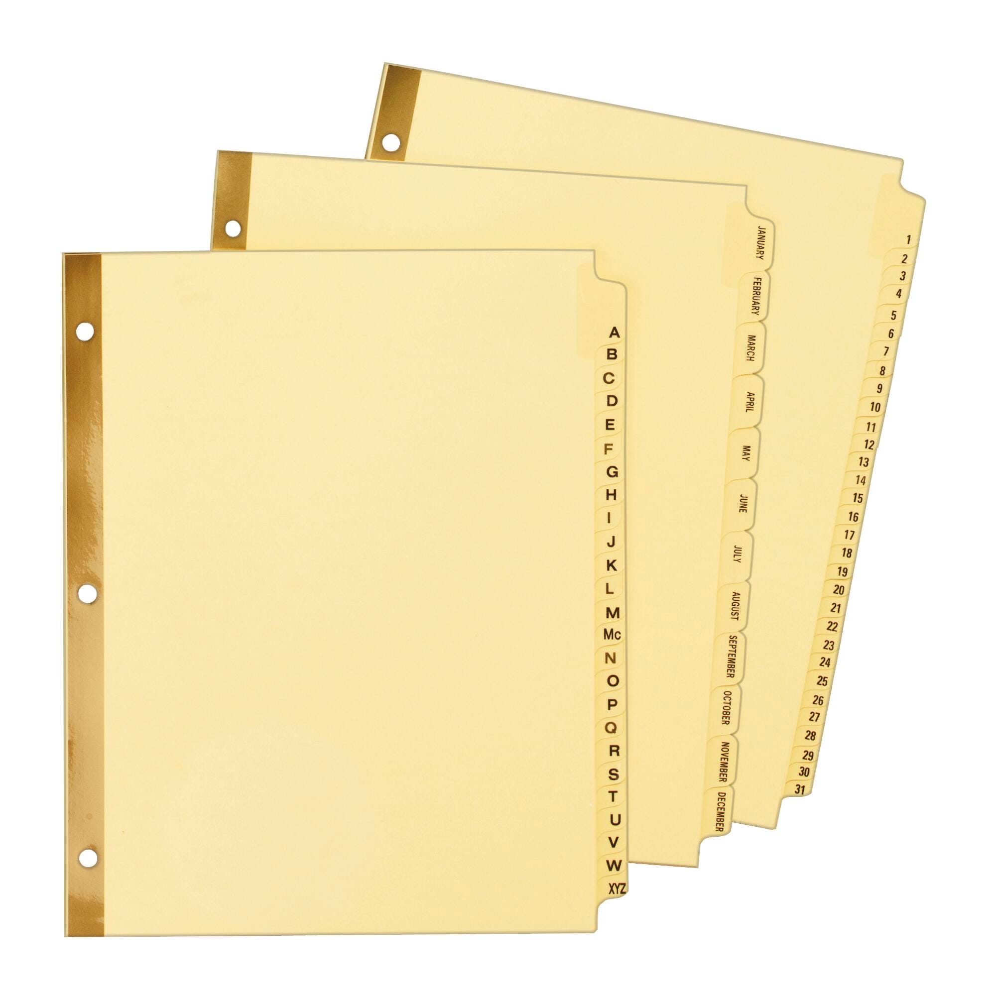 Avery 25 Tab (A-Z) Gold Reinforcement Laminated Tab Divider measuring 8-1/2 x 11 inches features gold rip-proof reinforcing which prevents pull-out at binder holes. Divider has laminated tabs printed front and back with easy-to-read characters. Divider featuring buff paper construction contains 30% post-consumer materials.
