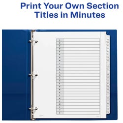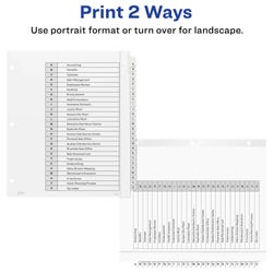 Coordinated divider system makes referencing easy and delivers a professional look. The set includes a reinforced Table of Contents page, matching preprinted tab dividers in black/white, added tab reinforcement, double-sided hole reinforcement on tabbed dividers and paper made of heavy stock. 2-in-1 tab design lets you pick between portrait and landscape formats. Simply print the section titles onto the Table of Contents page using your inkjet or laser printer. Tab dividers are also compatible with typewriters and copiers. Dividers are three-hole punched for use in binders. Avery offers many easy-to-use templates for Microsoft Word and other popular software programs.Features
