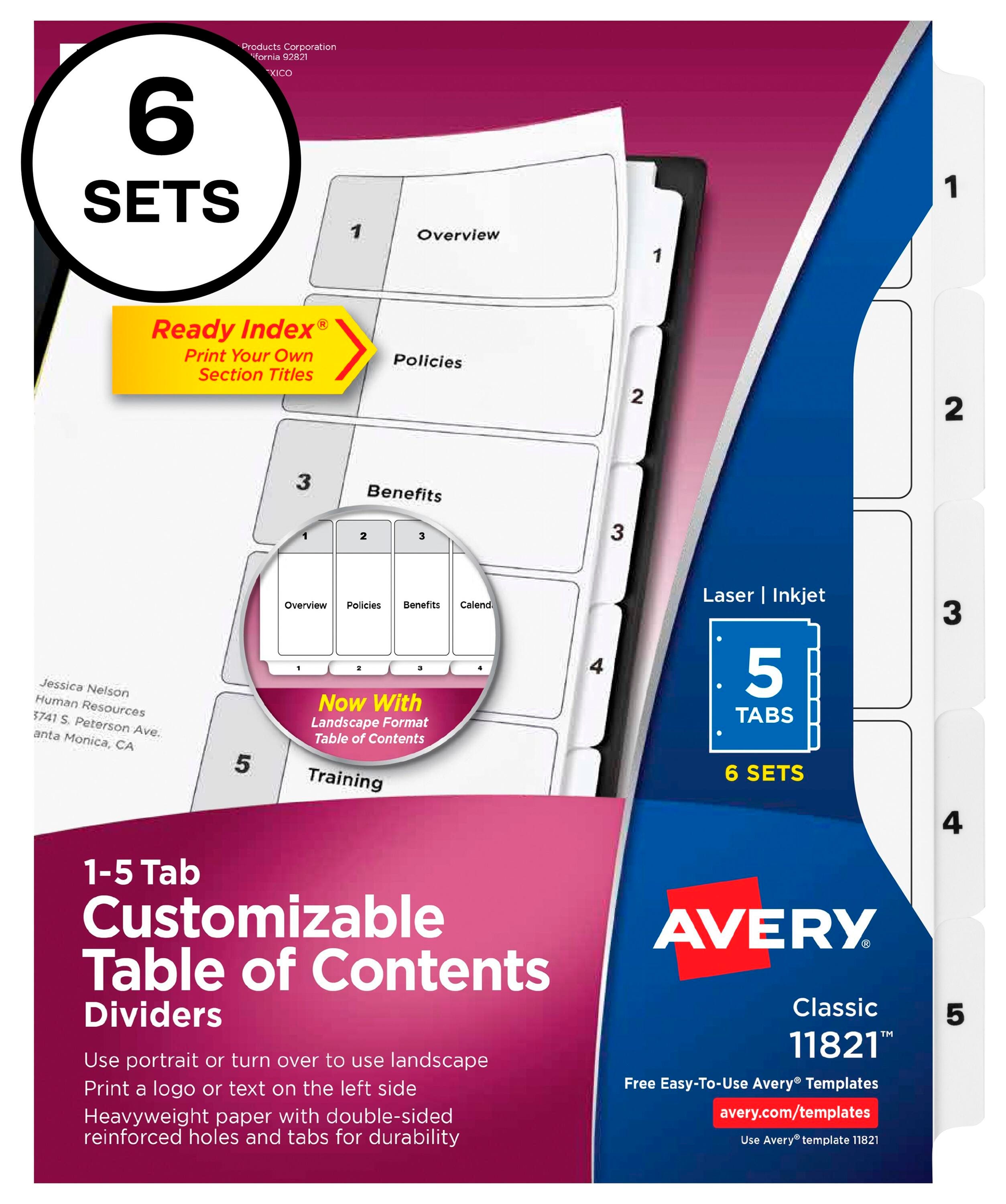 Coordinated divider system makes referencing easy and delivers a professional look. The set includes a reinforced Table of Contents page, matching preprinted tab dividers in black/white, added tab reinforcement, double-sided hole reinforcement on tabbed dividers and paper made of heavy stock. 2-in-1 tab design lets you pick between portrait and landscape formats. Simply print the section titles onto the Table of Contents page using your inkjet or laser printer. Tab dividers are also compatible with typewriters and copiers. Dividers are three-hole punched for use in binders. Avery offers many easy-to-use templates for Microsoft Word and other popular software programs.