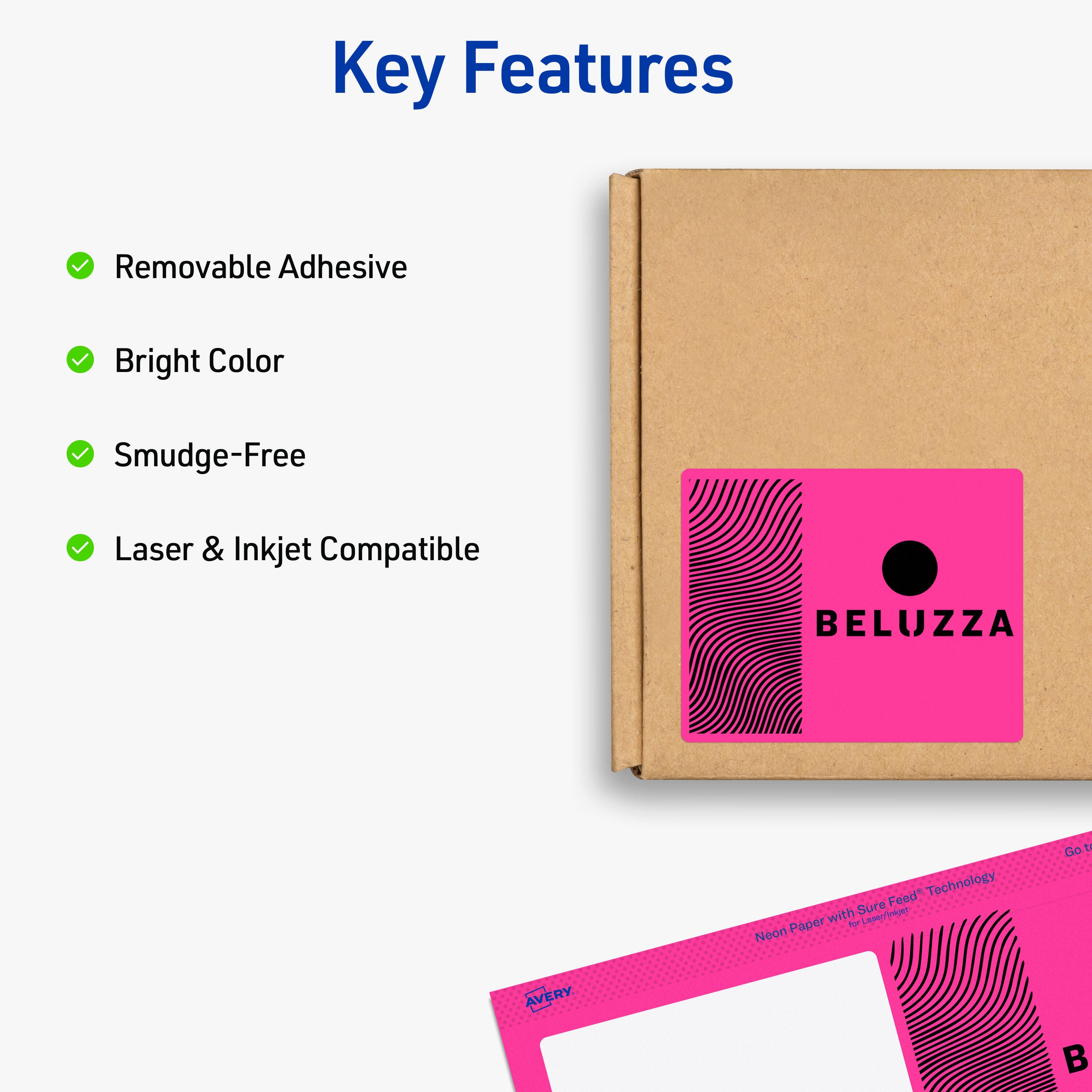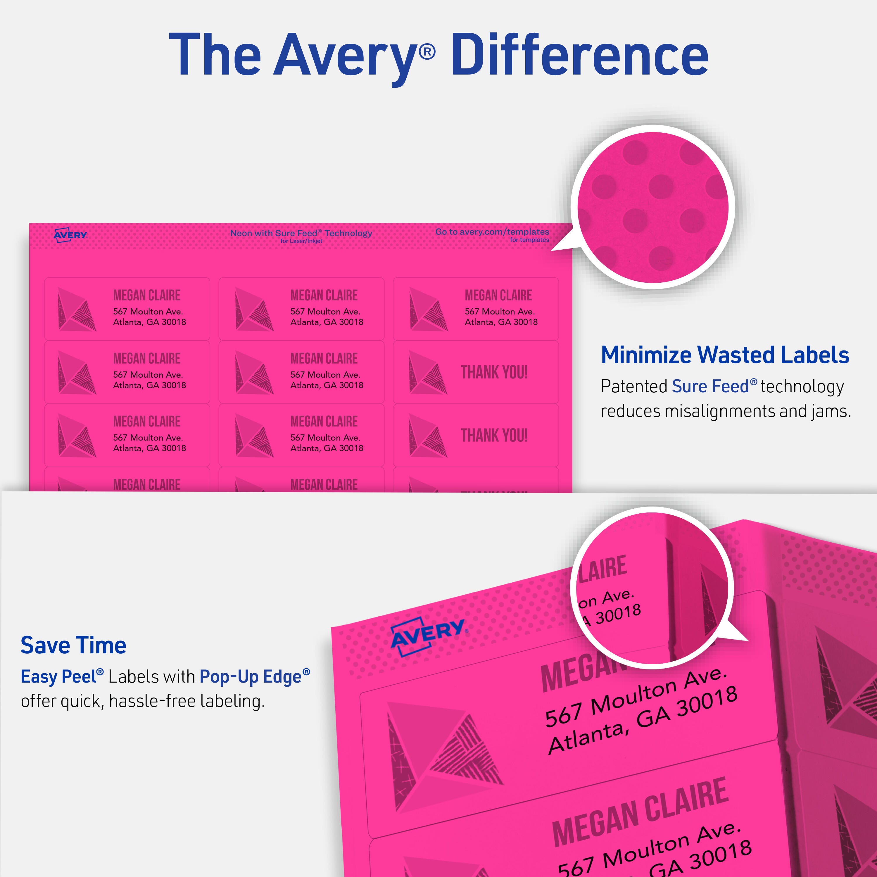 Multipurpose labels feature removable adhesive and neon colors. The labels adhere to smooth surfaces including paper, cardboard, plastic, glass and metal. Rectangular labels stick and stay, but remove cleanly, leaving no residue behind. Vibrant colors on each label make your message stand out. Assorted neon colors include pink, green and yellow. Multipurpose labels are compatible with laser and inkjet printers. Avery offers many easy-to-use templates for Microsoft Word and other popular software programs.