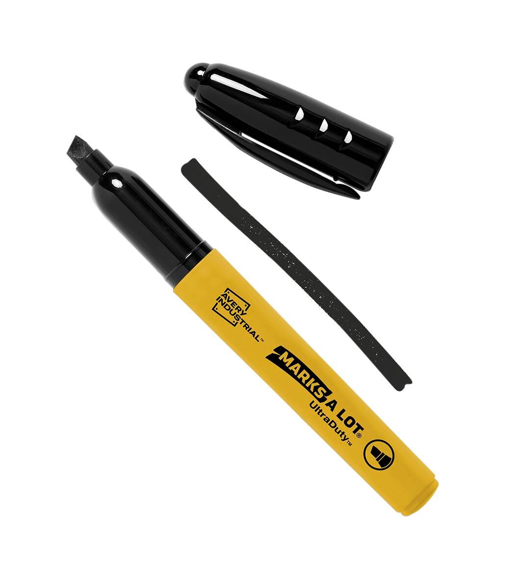 Get the job done with this 12 pack of Avery Marks A Lot UltraDuty markers with chisel tips and permanent black ink. Built for situations where standard permanent markers just aren't enough, Avery Marks A Lot industrial markers are perfect for construction sites, warehouses, workshops and more. The bold fast-drying ink works great on plastic, wood, metal and concrete. The durable 5mm chisel tip also works on abrasive, dusty, wet and oily surfaces without clogging. The angled chisel tip also allows you to write lines in varying widths to switch from narrow to bold on the spot.Features