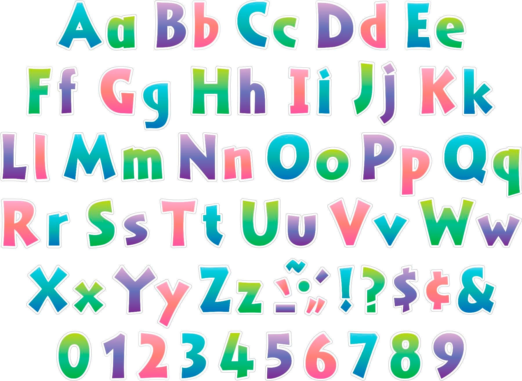 Barker Creek's Tie-Dye & Ombré Letter Pop-Out Set will make your bulletin boards, posters, and displays "POP"! The Tie-Dye design features the colors blue, purple, lime, and pink. The Ombré design features the colors aqua/blue, lilac/purple, yellow/lime, and coral/pink. This set includes a well-researched assortment of 510 letters, numbers, and punctuation marks (including Spanish). "Classy!"," Beautiful!"," Fun!"," Easy-to-use!"," Durable!"," Fashion-forward!" These are just a few compliments these beautiful letters have received. Coordinating products are available: Search Barker Creek Tie-Dye & Ombré.Features