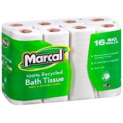 Marcal Small Steps 2-Ply Premium Bathroom Tissue with pattern is designed for softness. White tissue is made from 100% recycled content with 60% post consumer materials. Septic-safe tissue is virtually lint free and roll of 168 sheets is sold as 16 per pack. This item is Eco Friendly. 4-1/3 in L X 3.67 in W. Fiber. White.Includes: