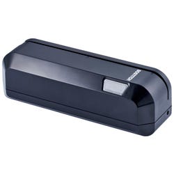 Cleanly punch up to 20 sheets of 20 lb paper with this dual-loading automatic 3-hole punch. This reliable hole punch can be powered with batteries or the AC power cord, allowing you to take your tasks on the go. Dual orientation design allows paper to be loaded horizontally or vertically to maximize convenience and safe space. The compact modern design suits any desktop, and the adjustable paper guide enables you to punch documents in a variety of sizes with exact alignment every time. This hole punch features an easy-clean chip drawer for a spotless work environment and durable steel punch heads. This device uses 6 AA batteries to operate on battery power. Batteries not included.Features