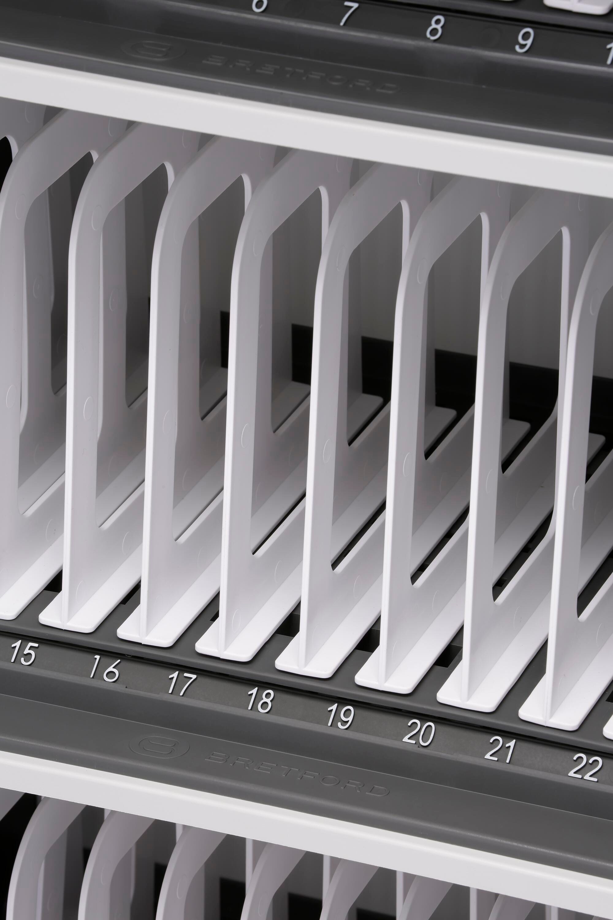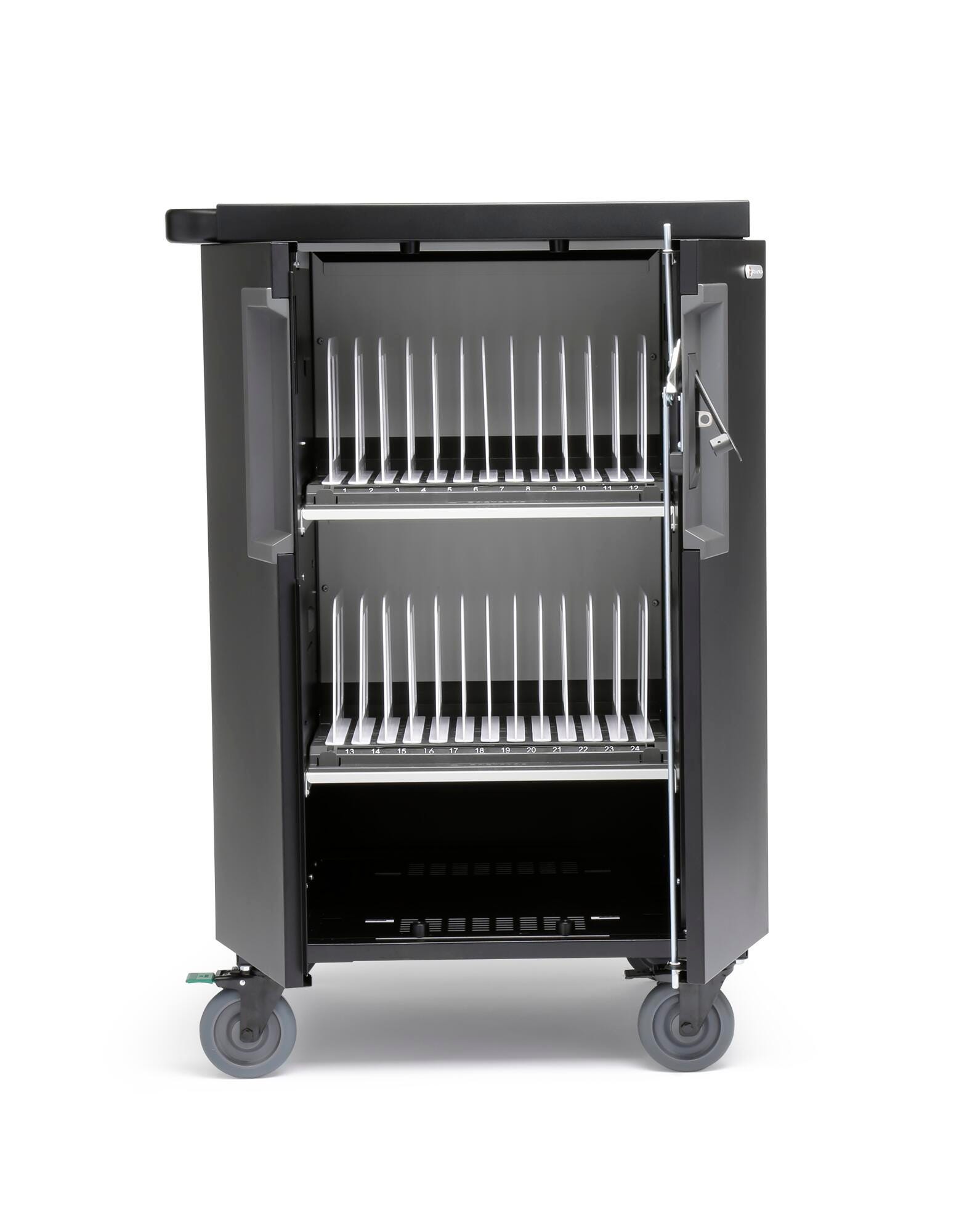 Support large technology initiatives with secure charging throughout your building, facility, or campus. Offered with two or three shelves to support from 24 to 36 devices. Slot numbering bars allow for device organization and management. Digital Timer system assures devices are charged quickly with one cord from cart to wall outlet. Top of the cart provides a work surface and courtesy power for a laptop or other accessory up to 8 pounds.Adjustable dividers allow modification of slot size from 1.25? to 1.5? to support various sizes of devices and numbering bars keep devices organized. Cart is designed and certified for safety, and the lock and sturdy solid steel construction keep devices secure. Directional locking casters allow for maximum control during transport and offset locks protect walls and doorframes.
