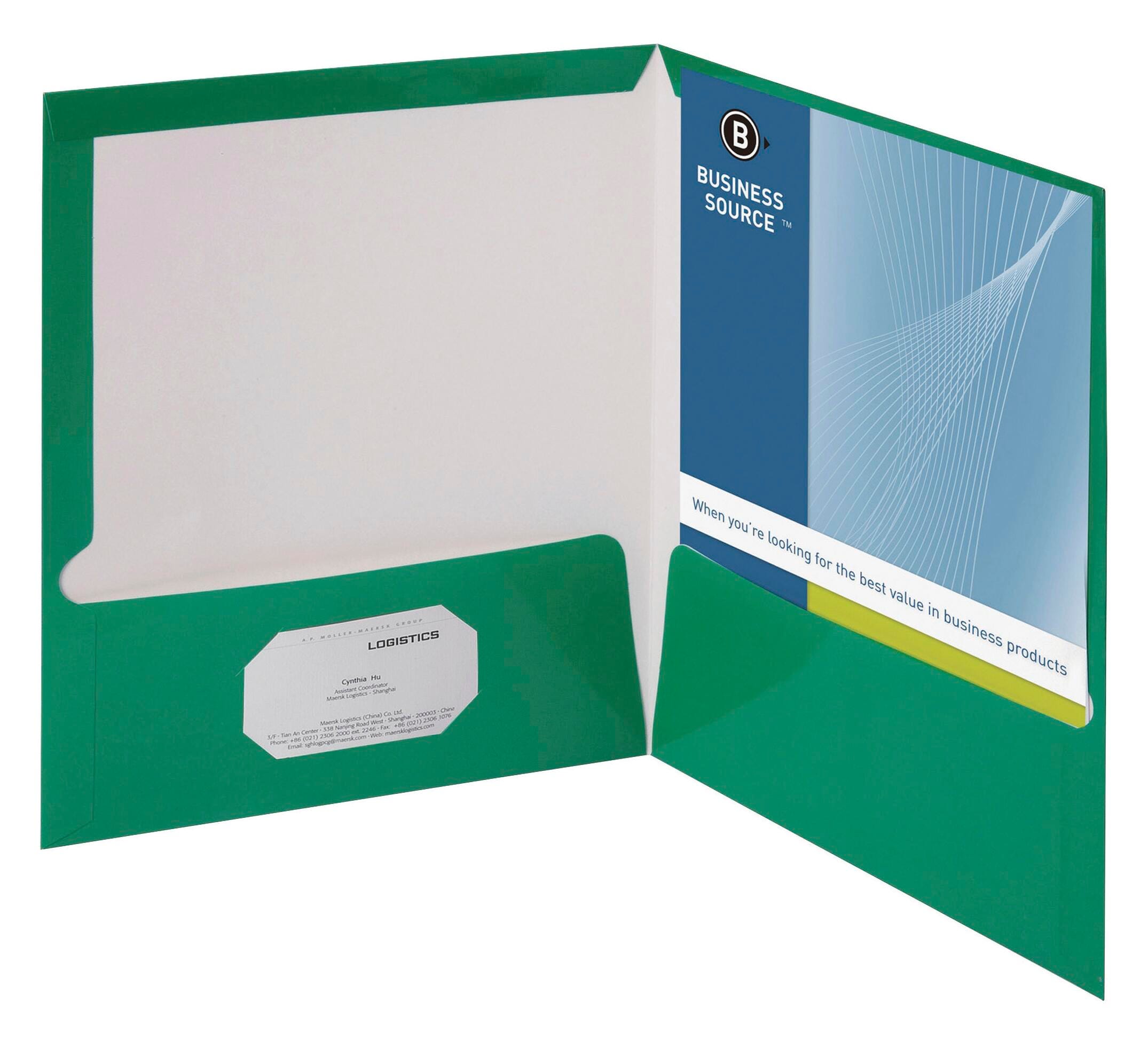 Business Source 2-Pocket Laminated Folder, 100 Sheet Capacity, Green, Pack of 25