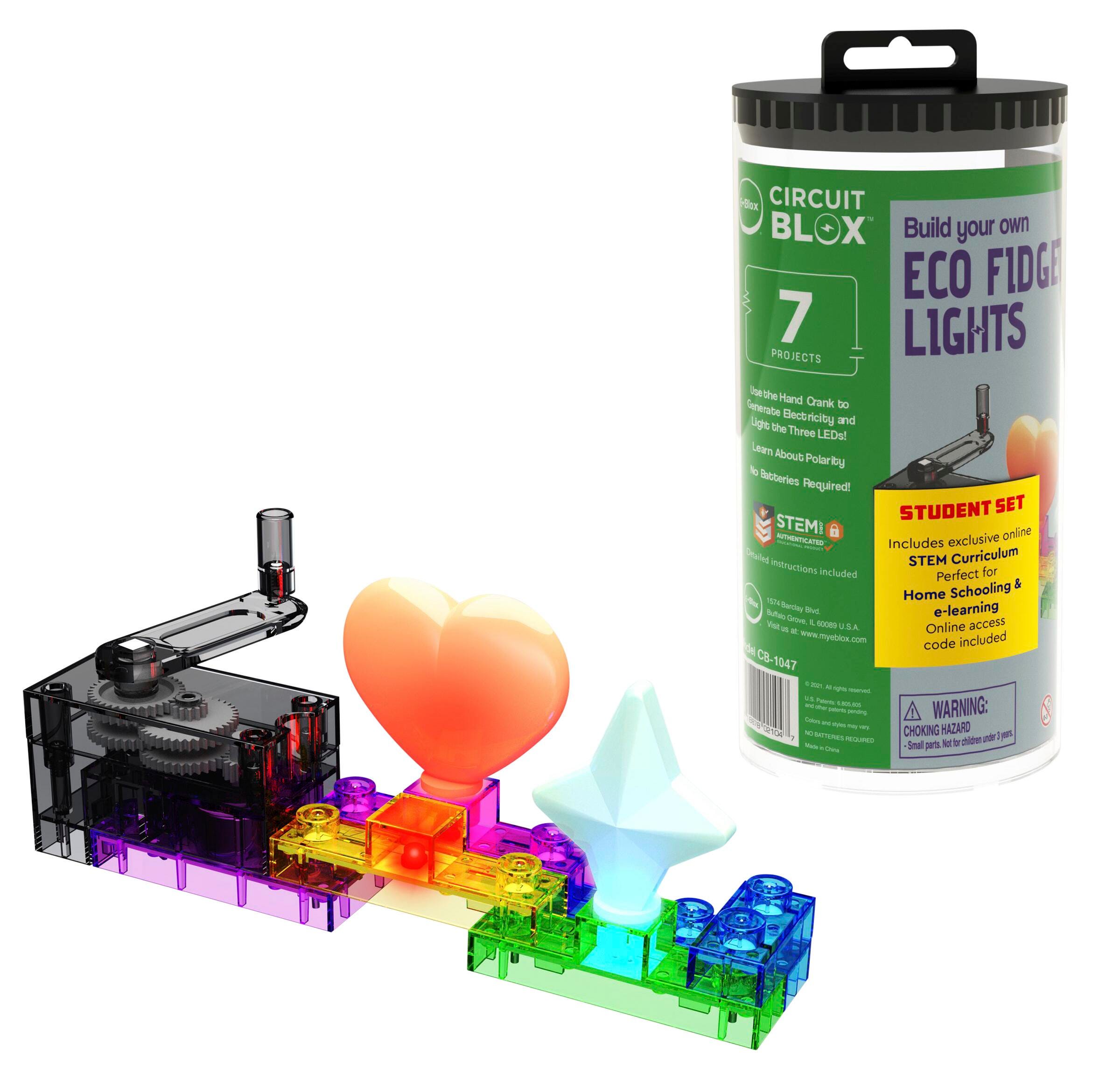 This set is ideal for home schooling and teaching through e-learning of STEM. The colorful building blocks contain electronic components such as a generator, LEDs, and a hand crank. Includes online animated curriculum only available with E-Blox Student Sets. Lessons address NGSS requirements and cover Electricity & Circuit, Generators, Light and Series & Parallel Connections.Features
