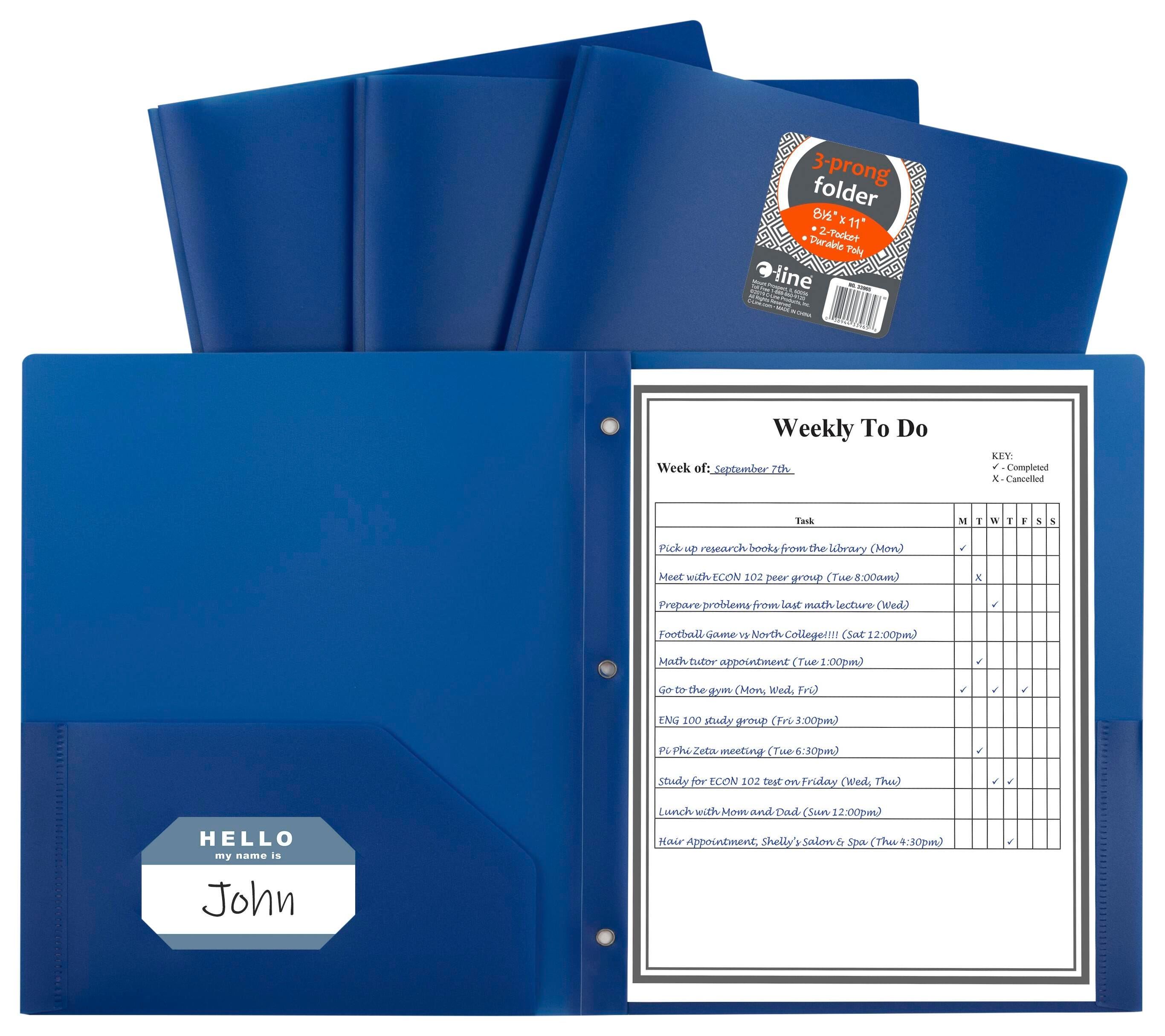 These specialty two-pocket heavyweight polypropylene folders from C-Line keep standard letter-sized papers organized, protected, and easily accessible. These 2 pocket plastic folders are tear-resistant, meaning they'll stay looking professional for as long as you need them. They also include a business card slot and prongs to secure 3-ring punched paper. Perfect for those who need a portfolio folder or an art folder. Sold as a pack of 25 blue folders.Features