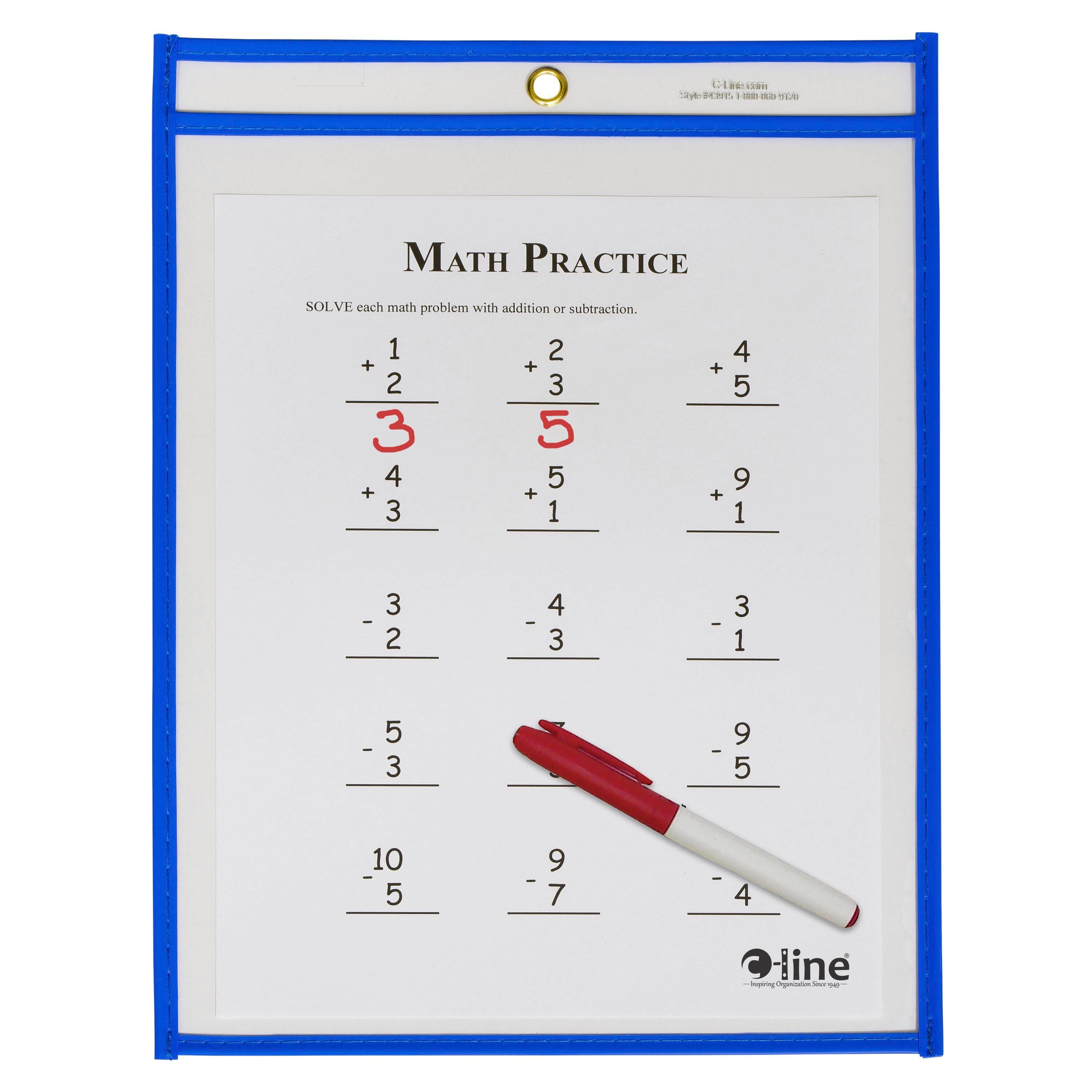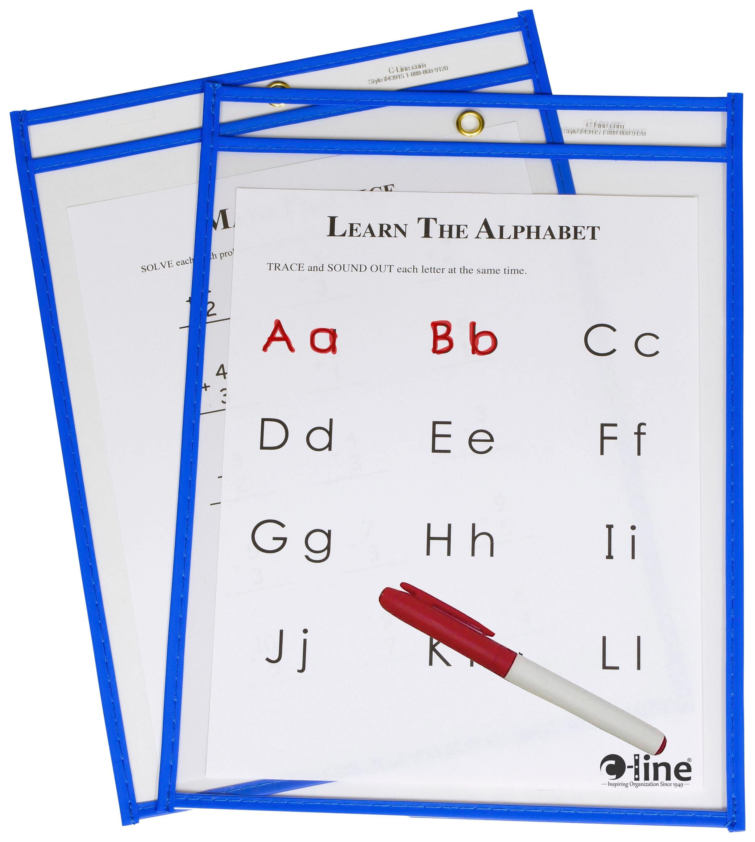 These Reusable Dry-Erase Pockets from C-line allow students to practice their skills while you save time, money, and paper. The handy pockets offer an eco-friendly option by eliminating the need to copy worksheets over and over again. They are designed for use with dry-erase markers and are easily cleaned with a soft cloth or tissue. Each pocket measures 9 x 12 inches to fit standard letter-sized documents. This box contains 15 neon blue pockets.Features
