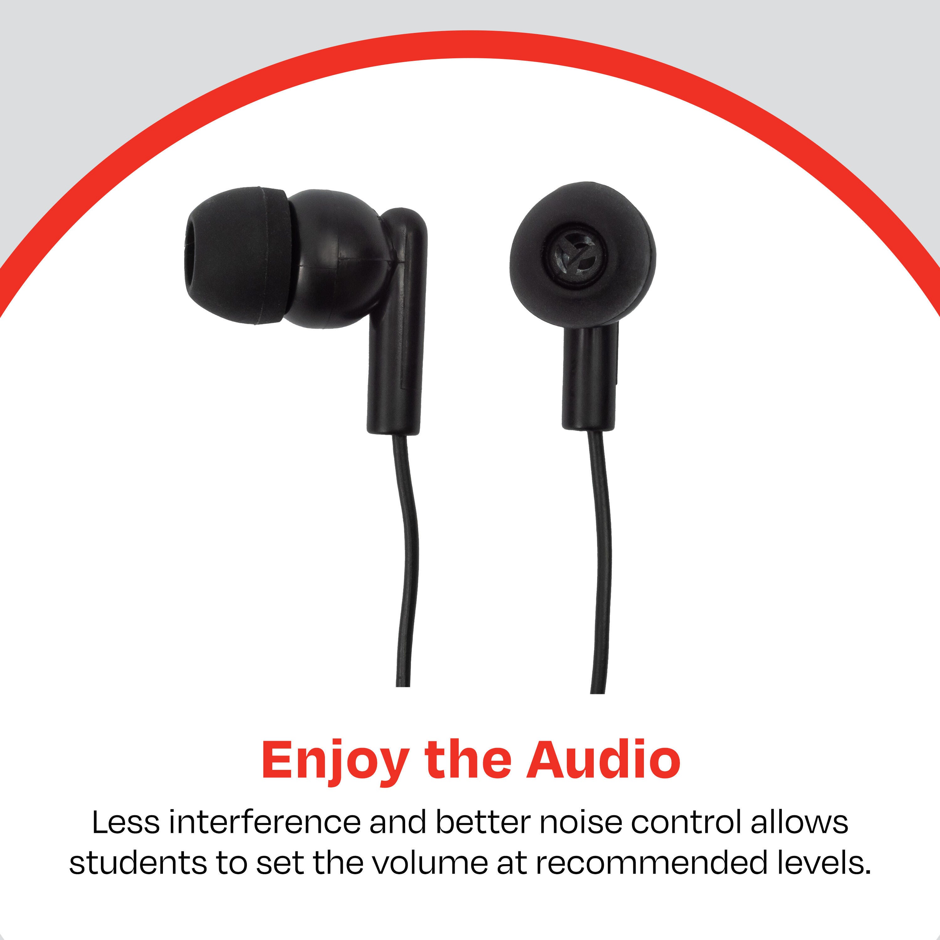 Califone E1 Stereo Earbuds have a lightweight earbud design for multi-purpose use inside and outside the classroom. The classic earphones are a budget-friendly solution for daily use at school or after-school programs. A durable earphone construction delivers full-bodied sound suitable for listening to lessons, testing, or enjoying entertainment while traveling. Made with flanged ear covers to decrease ambient noise, the small earphones come with a 3-1/2 foot straight cord and 3.5mm stereo plug. These wired earphones are compatible with iOS, Windows, Android-based devices, Chromebooks, iPads, tablets, smartphones, desktops, and laptop computers. This earbud model is backed by a 30-day warranty for school use.