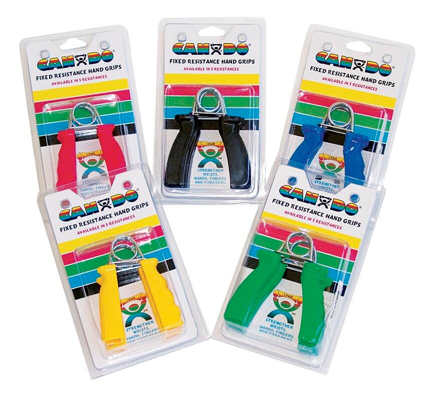 CanDo ErgoGrip Hand Exerciser is sold in pairs. Weight equals the amount of force needed to fully compress the fixed ErgoGrip handles. The new CanDo resistance sequence on these ergonomic grips covers any needs from the earliest stages of rehabilitation after stroke (yellow) to advanced athletic training (black). The force equivalent doubles with each level so you can work your way up. ErgoGrip measures 4 W x 1 D x 5 L inches. Set of 2.