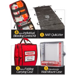 North American Rescue Bleeding Control Kit is designed to be mounted on a wall at a designated location. Provides publicly accessible medical supplies to control major bleeding. Stored in a durable, clear polycarbonate cabinet with "Stop the Bleed" placards for fast identification.Includes:
