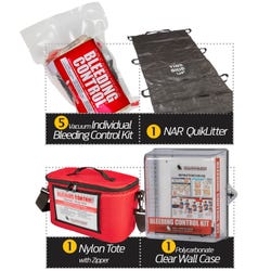 These Wall Stations include 5 individual Bleeding Control Kits packaged in vacuum sealed pouches stored within an easy to open nylon carrier and includes 1 NAR QuikLitter for moving injured casualties.