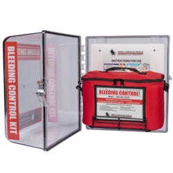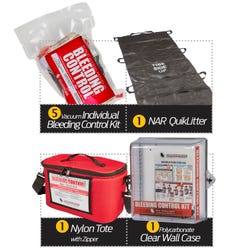 These Wall Stations include 5 individual Bleeding Control Kits packaged in vacuum sealed pouches stored within an easy to open nylon carrier and includes 1 NAR QuikLitter for moving injured casualties.
