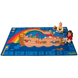 Sit alongside Noah's arc on this heavenly carpet that's soft for storytime and circle time yet durable to meet the needs of high-traffic areas. Features an educational border with squares featuring uppercase letters of the alphabet in ABC order. This area rug pairs well in early education spaces such as preschools, playrooms, childcare centers, or young classrooms, specifically those working in religious areas. Made with true stain blocker technology that makes clean-up a cinch using only hot water extraction with no harsh chemicals necessary. All of the fibers are completely saturated with the stain treatment. This rectangle carpet is available in several sizes to best fit your space. Please select the size that fits your space best when ordering.Features