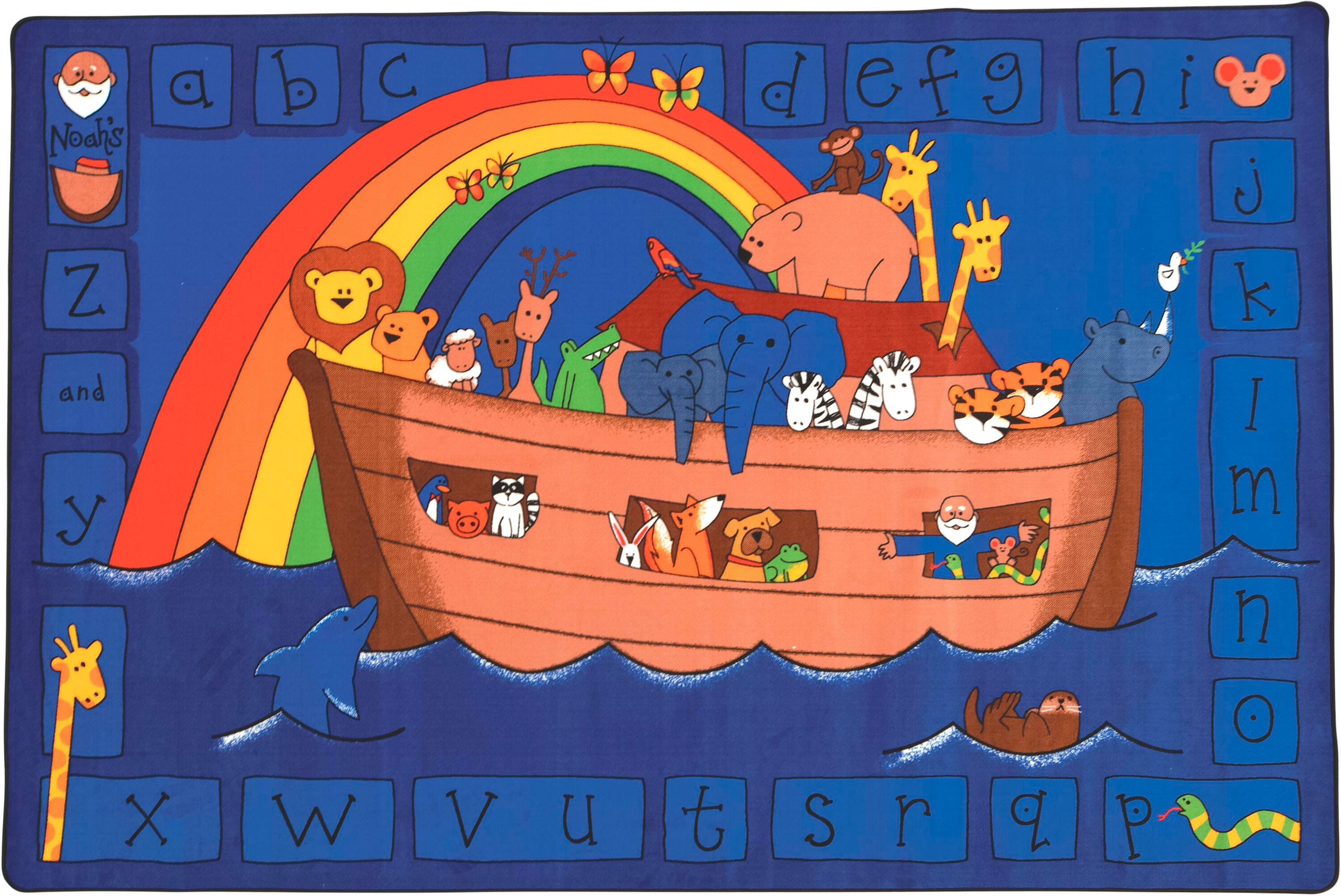 Sit alongside Noah's arc on this heavenly carpet that's soft for storytime and circle time yet durable to meet the needs of high-traffic areas. Features an educational border with squares featuring uppercase letters of the alphabet in ABC order. This area rug pairs well in early education spaces such as preschools, playrooms, childcare centers, or young classrooms, specifically those working in religious areas. Made with true stain blocker technology that makes clean-up a cinch using only hot water extraction with no harsh chemicals necessary. All of the fibers are completely saturated with the stain treatment. This rectangle carpet is available in several sizes to best fit your space. Please select the size that fits your space best when ordering.Features