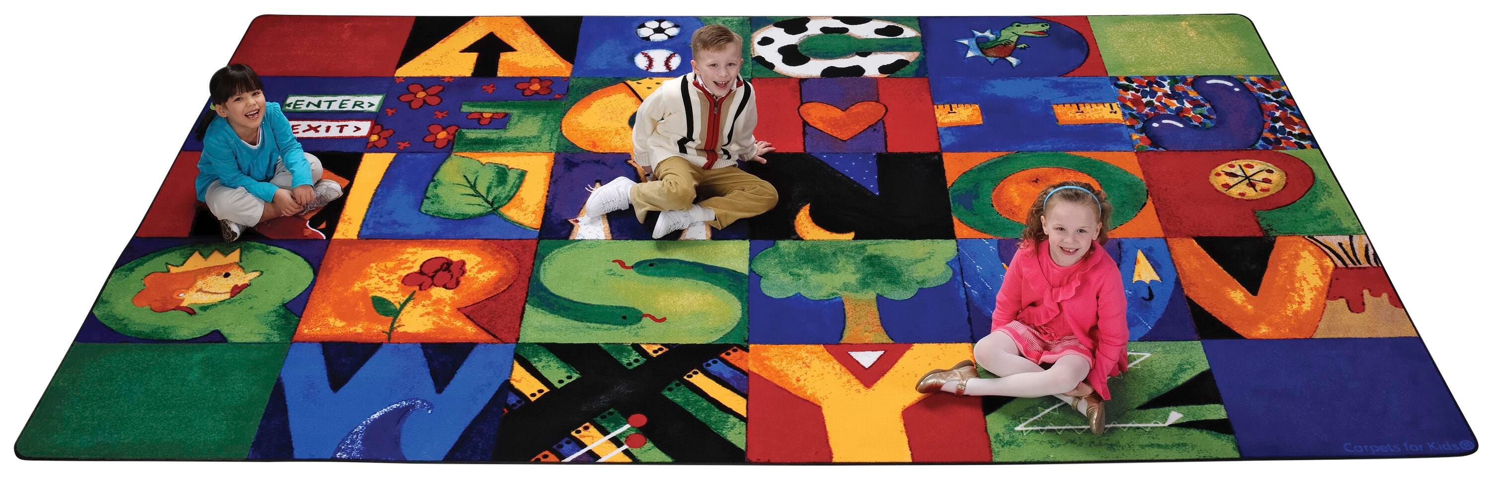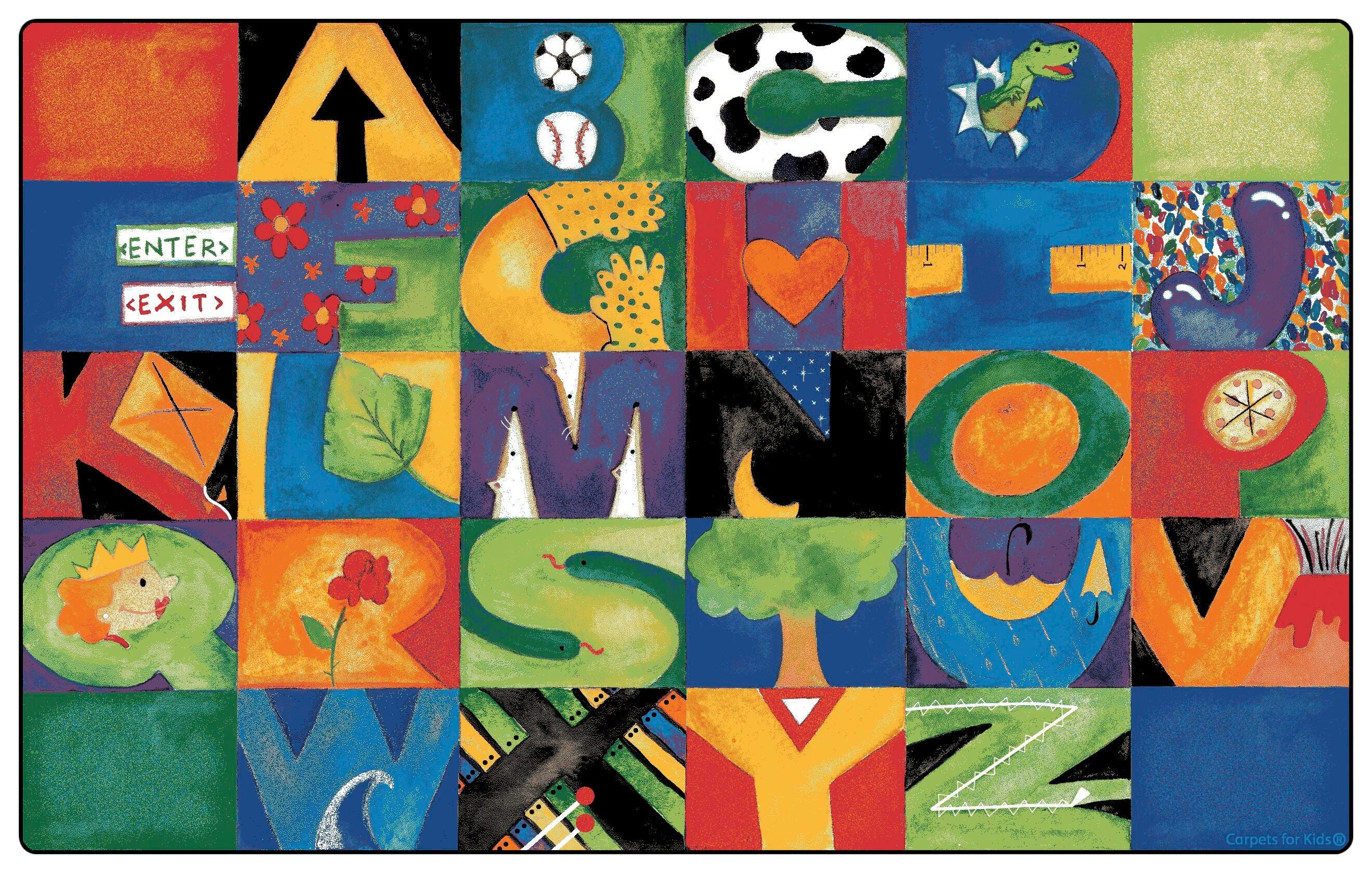A is for arrow, B is for ball, C is for cow. This seating rug will challenge little learners to find the hidden alphabet letters in each square. This area rug provides a great way to teach letter recognition and literacy, while providing ample seating for students to choose a spot of their own to sit. Perfect for spaces that focus on ABC learning such as preschools, playrooms, childcare centers, and early learning classrooms. Made with true stain blocker technology that makes clean-up a cinch using only hot water extraction with no harsh chemicals necessary. All of the fibers are completely saturated with the stain treatment. This rectangle carpet is available in several sizes to best fit your space. Please select the size that fits your space best when ordering.Features