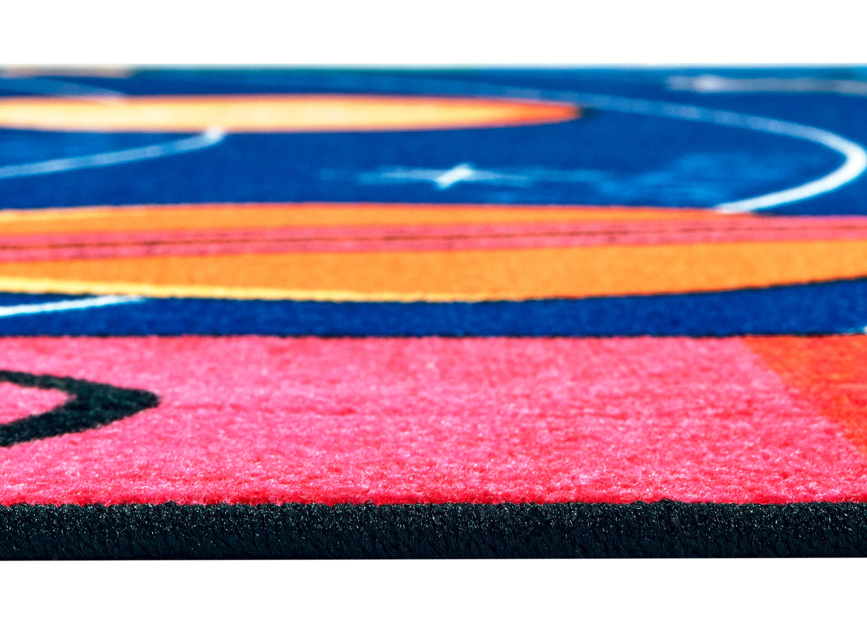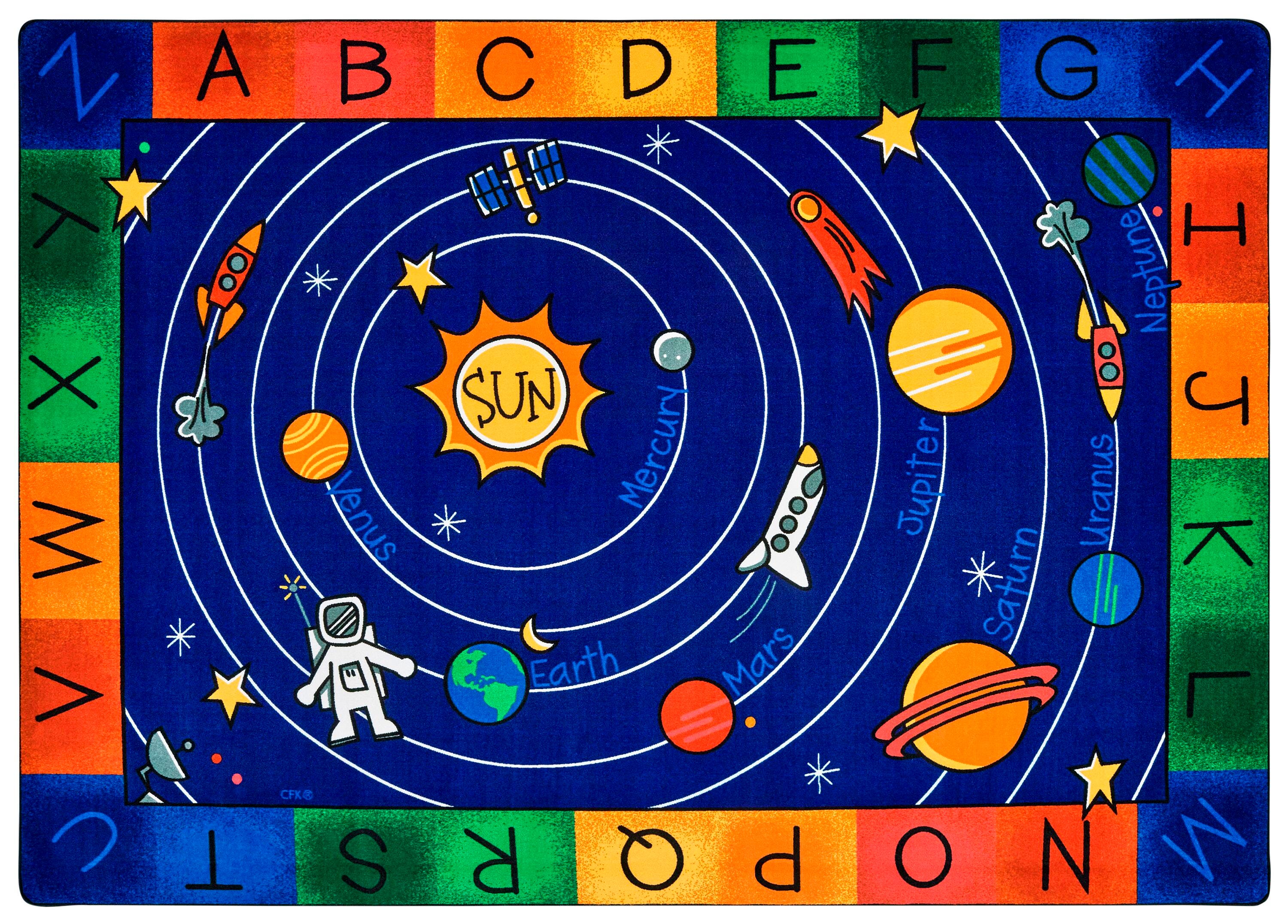 This classroom carpet design features an alphabet border that surrounds a picture of the Milky Way Galaxy, a design perfect for a more organized and inspired circle time or story time. Design features all 8 planets along with cute space icons, stars, and dots representing smaller dwarf planets. Perfect for classrooms that want to explore the great beyond - in preschool, playrooms, childcare centers, and classrooms. Made with true stain blocker technology that makes for easy clean-up using only hot water extraction with no harsh chemicals necessary. All of the fibers are completely saturated with the stain treatment. Available in several sizes to best fit your space. Please select the size that fits your space best when ordering.Features