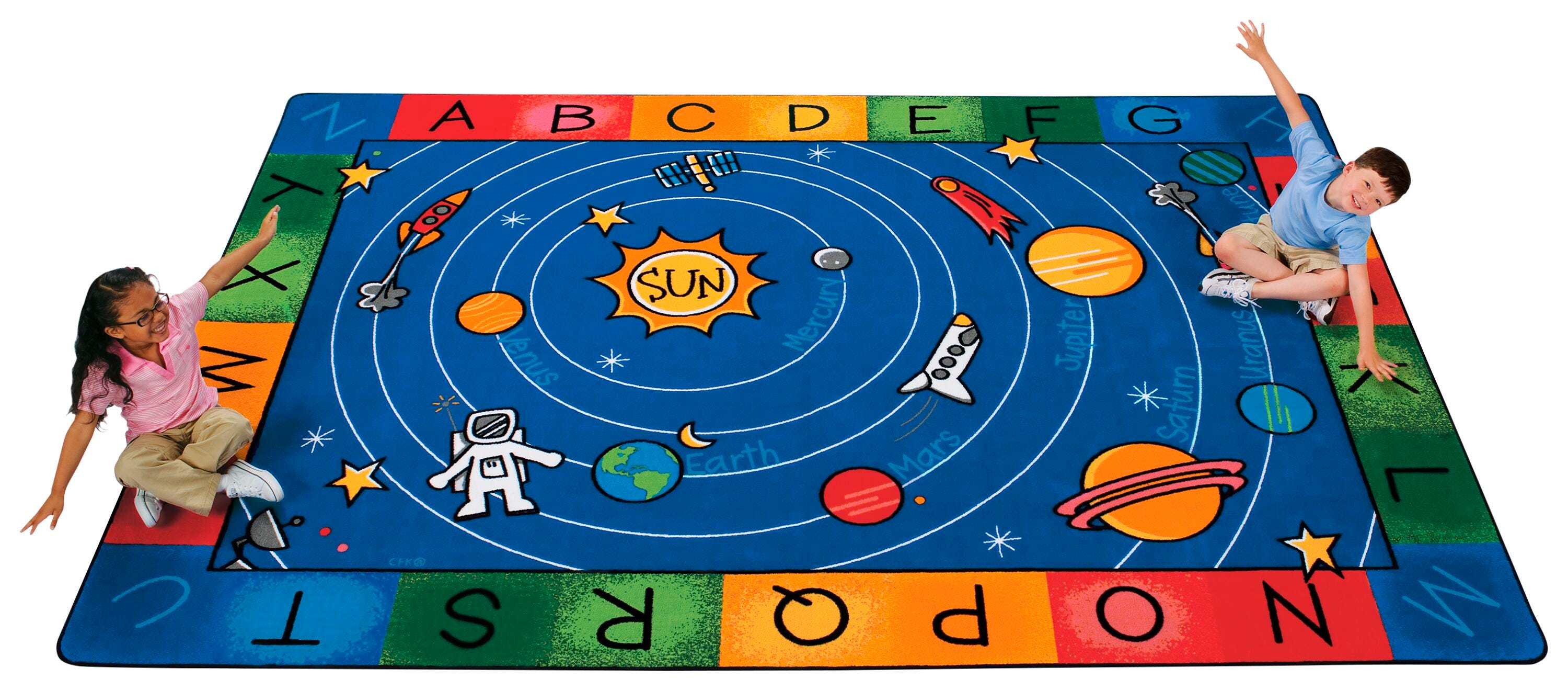 Blast off to a galaxy of fun and learning! This educational rug introduces students to what lies beyond our ozone, featuring all eight planets with dots representing dwarf planets. Available in several sites.