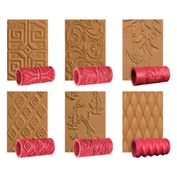 AMACO Clay Texture Rollers allow you to roll out a continuous design on a slab of clay. Watch a plain slab become an instant work of art. Decorate textured bisque with glazes to accent the texture. Create tiles, vessels and more. Texture sleeves measure 4 inches wide. Set includes 6 each of sleeves and handles.Includes 6 Texture Rollers: