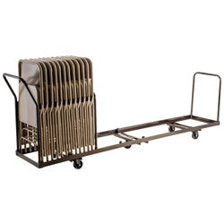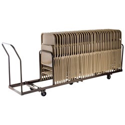 Chair Caddy Chair caddy built for easy handling provides stability for storing and transporting. Features a solid steel powder coated construction. Additional handle bar sockets allow secure placement of chairs. Strategically placed handle positions lock chairs in almost any spot on the dolly. Holds 50 folded chairs that are 15-1/4 up to 19 inches wide. Overall dimensions are 19-1/4 L x 109-1/2 W x 38-1/2 H inches. Inside width 19 inches with a 2 inch lip. Chairs not included.Features