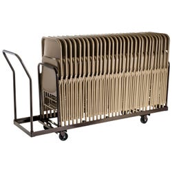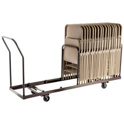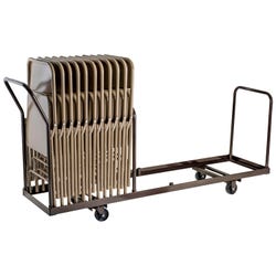 Chair Caddy Chair caddy built for easy handling provides stability for storing and transporting. Features a solid steel powder coated construction. Additional handle bar sockets allow secure placement of chairs. Strategically placed handle positions lock chairs in almost any spot on the dolly. Holds 35 folded chairs that are 15-1/4 up to 19 inches wide. Overall dimensions are 19-1/4 L x 81 W x 38-1/2 H inches. Inside width is 19 inches with a 2 inch lip. Chairs not included.Features