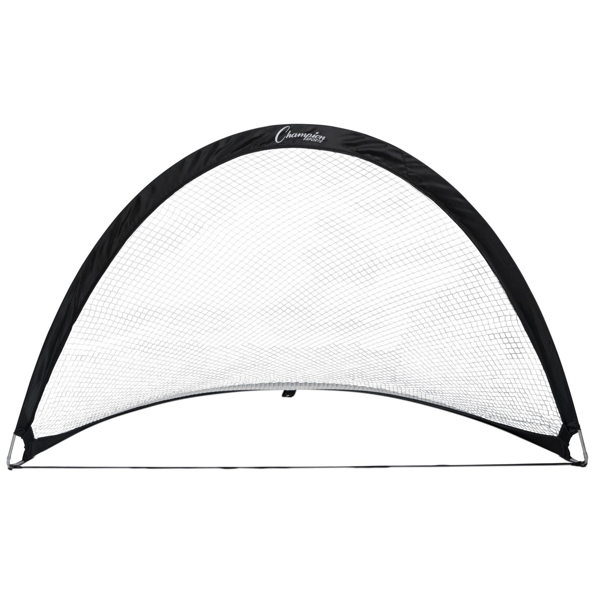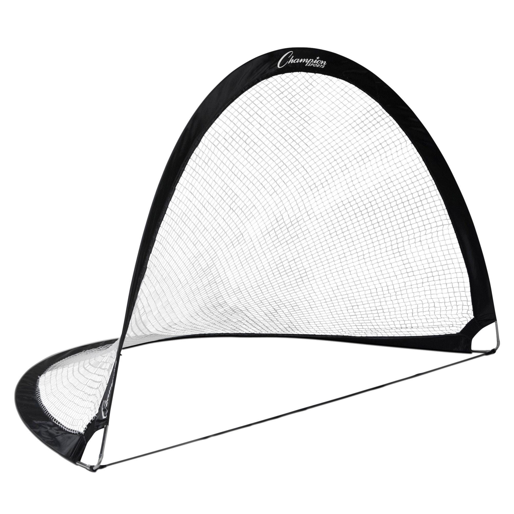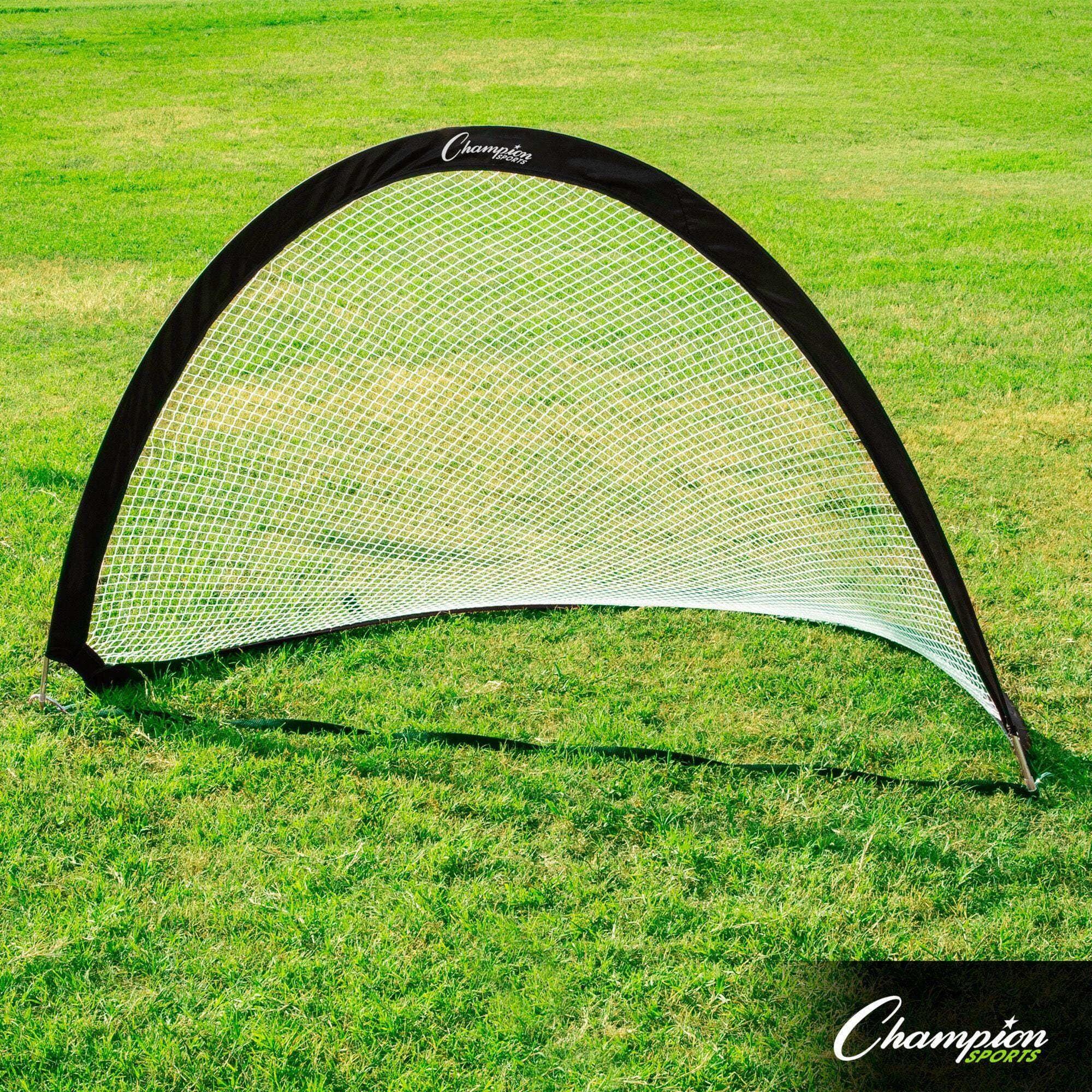 Champion Sports Pop-Up Soccer Goals are a must-have for quick pickup games or practice. The half-moon pop-up design makes for easy assembly and disassembly. These goals offer great durability and stability, with an 8 mm mesh polyester net, 3 nylon anchor pegs, a poly/steel frame construction, and gusseted nylon corners. Elastic anchor tethers and hook and loop fasteners are included to hold the goals in a folded position for storage. This set includes 2 goals that both measure 72 H x 40 W x 40 D inches.