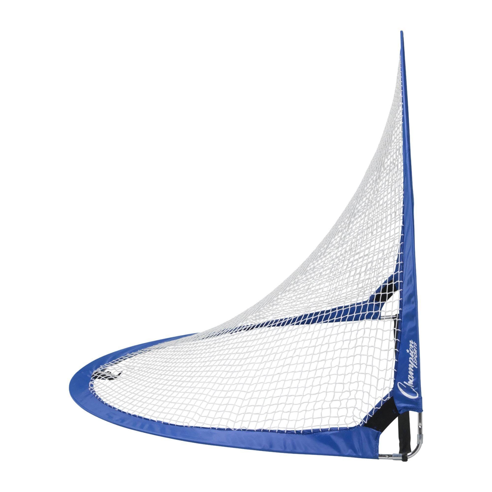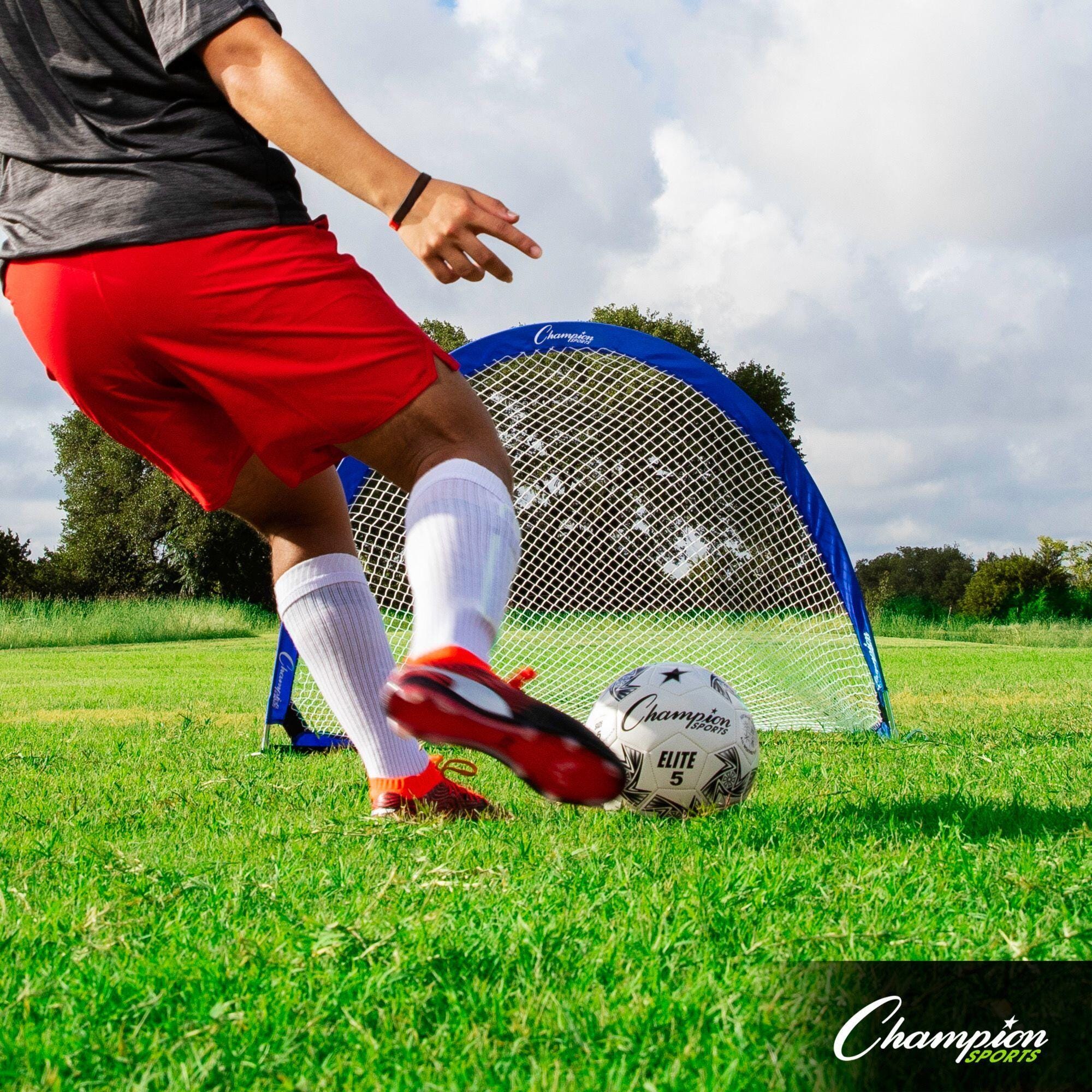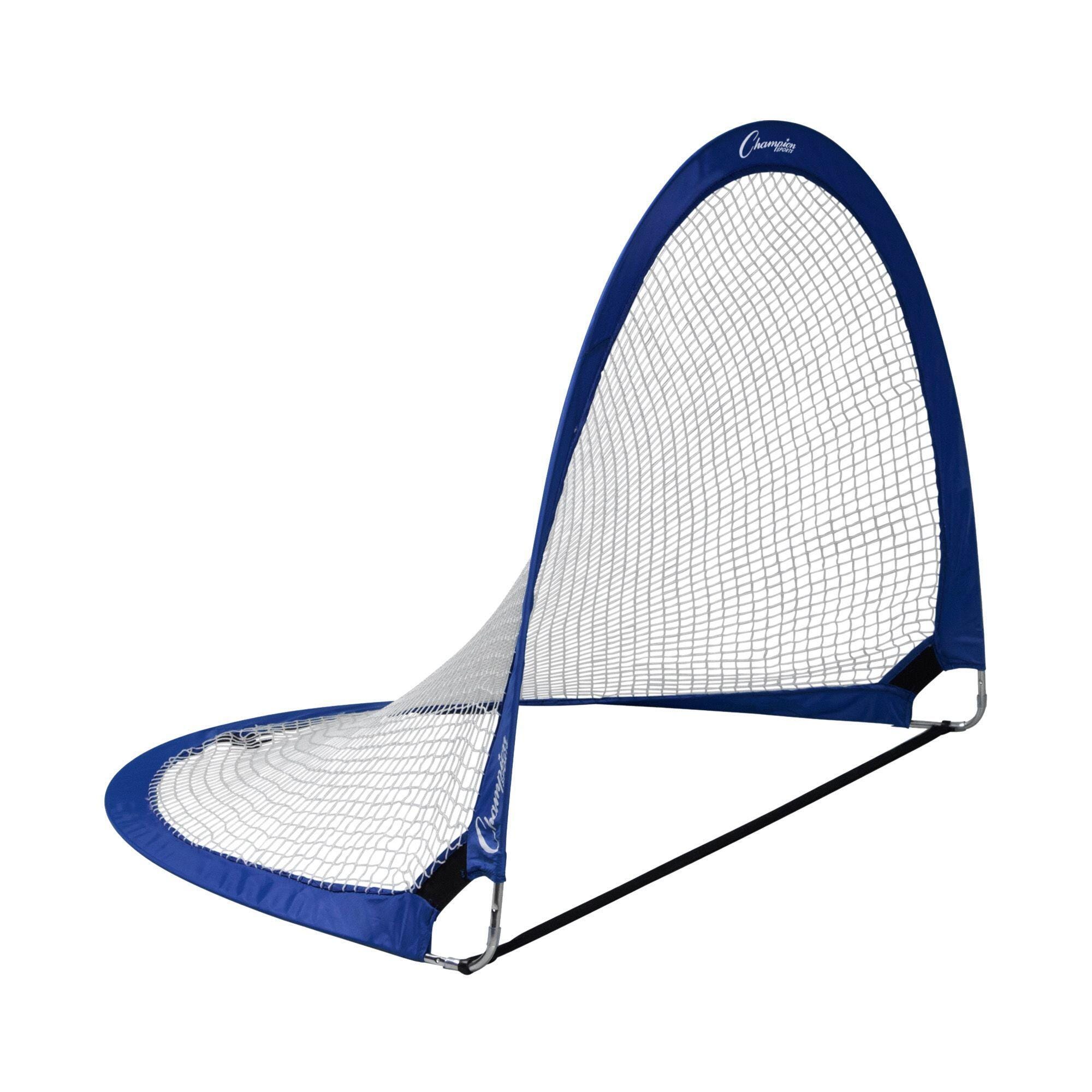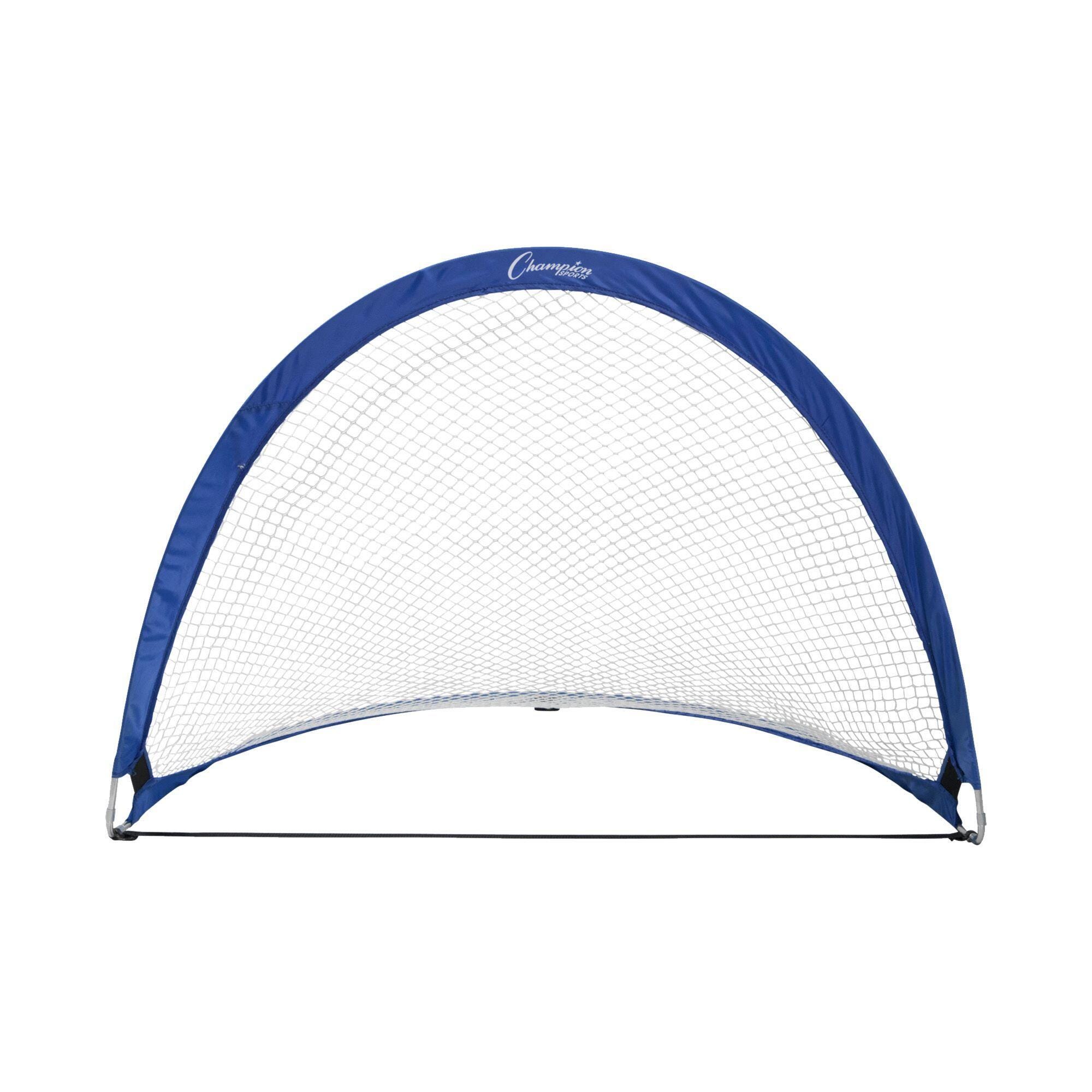 Champion Sports Pop-Up Soccer Goals are a must-have for quick pickup games or practice. The half-moon pop-up design makes for easy assembly and disassembly. These goals offer great durability and stability, with an 8 mm mesh polyester net, 3 nylon anchor pegs, a poly/steel frame construction, and gusseted nylon corners. Elastic anchor tethers and hook and loop fasteners are included to hold the goals in a folded position for storage. This set includes 2 goals that both measure 48 H x 30 W x 30 D inches.