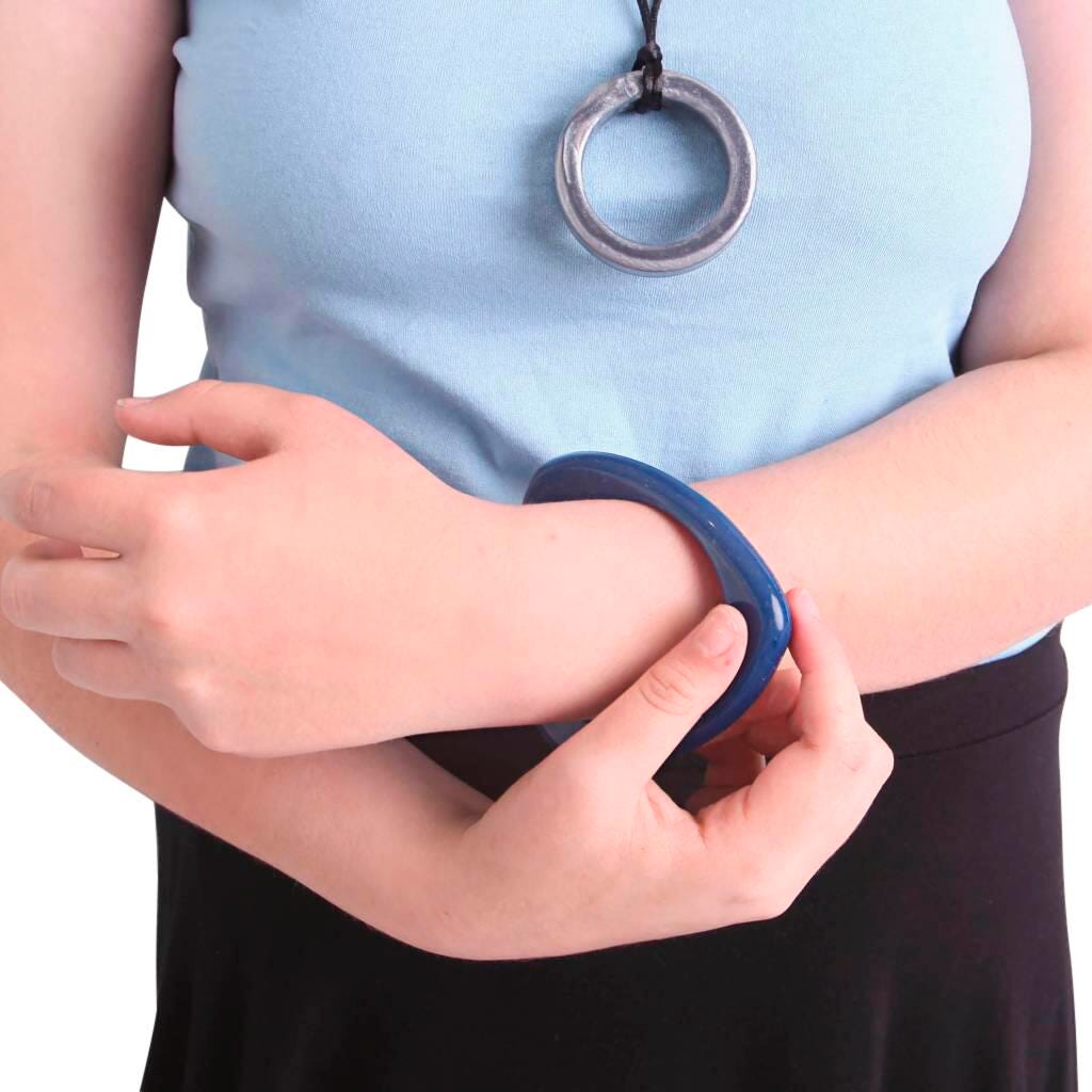 As much a statement jewelry piece as it is a wearable fidget, the Chewigem Bermuda is a thing of beauty. Its unique, triangle shape has varying thicknesses as well as rounded and straight edges. It can be worn on the wrist or held in the hand.Features