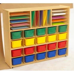 The Childcraft® ABC Furnishings Storage Unit offers ample cubby space to store books, games, supplies, and more. The open storage design allows children to independently access their belongings, while the included 20 colored trays provide easy organization for smaller items. Each bin measures 7-3/4 W x 12 D x 5-1/4 H inches. Top inserts help keep papers, mail, and homework organized. Crafted from birch plywood with a durable, stain-resistant finish, this cabinet is built to withstand daily use in busy learning environments. Measures 48 W x 13 D x 40 H inches. Assembly required.Features