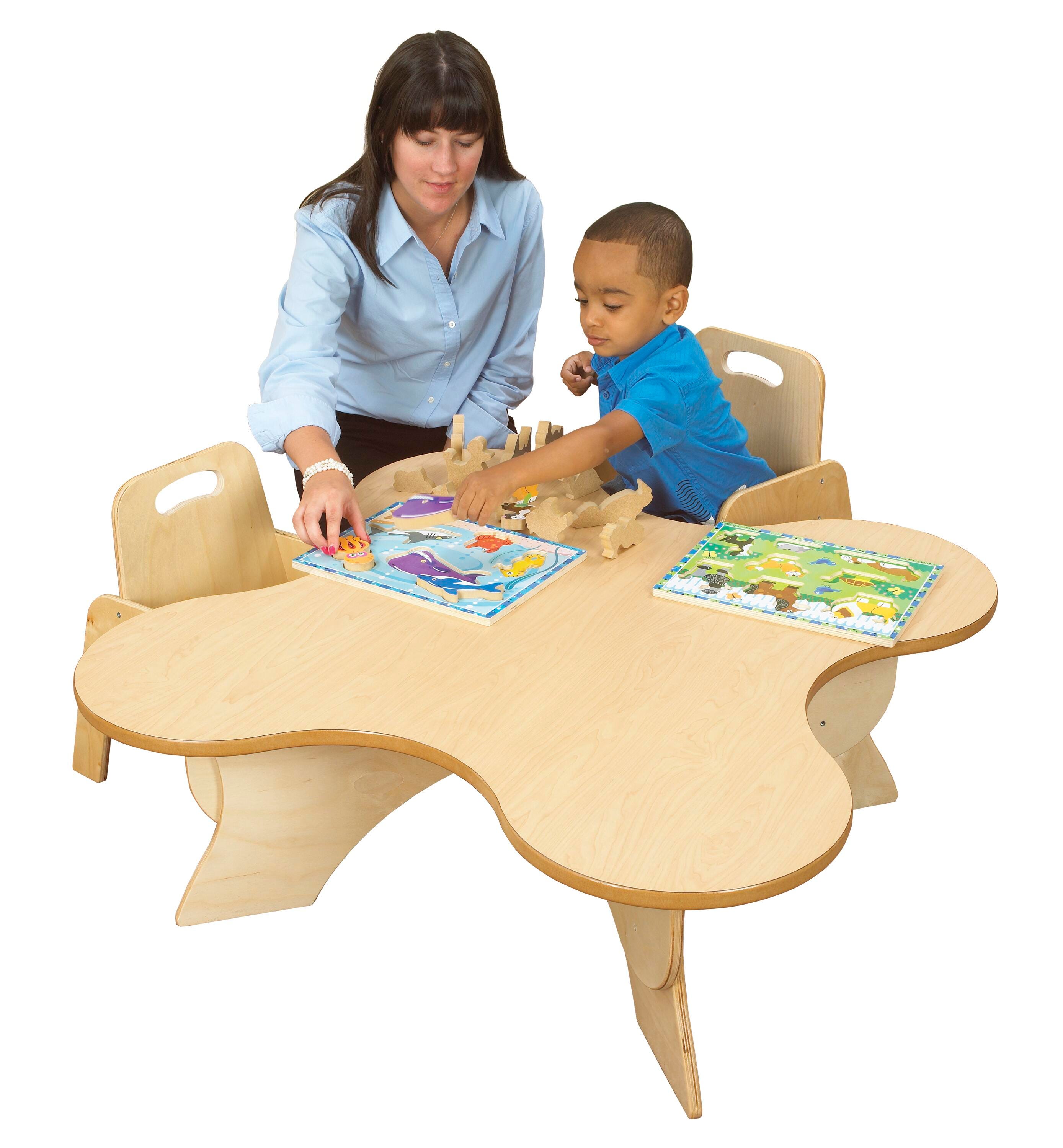 The Childcraft® Blossom Adjustable Toddler Table adds charm and functionality to classrooms, childcare centers, and play areas. With a whimsical four-petal design, this unique table comfortably seats up to four toddlers, giving each child their own space to create, read, or play. The activity table height easily adjusts to 14, 16-1/2, or 19 inches to accommodate growing toddlers and a variety of seating options. Crafted from durable birch plywood, the rounded edges and smooth surface offer a safe and easy-to-clean workspace. The wooden table measures 35-3/4 W x 35-3/4 D inches. Simple assembly required. Chairs sold separately.