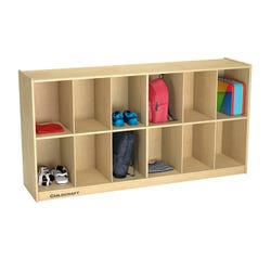 The Childcraft® Mobile Cubby Storage Unit with 12 cubby openings provides ample space for organizing lunches, gym shoes, personal supplies, and classroom essentials in classrooms, childcare centers, and homes. Each cubby opening measures 9-1/4 W x 13-7/8 D x 14-1/2 H inches and offers flexible storage options. The heavy-duty caster wheels provide effortless mobility around the room. Crafted from durable birch plywood with a beautiful natural veneer finish, this cubby cabinet is built to last. Measures 58-3/8 W x 14-1/4 D x 30 H inches. Comes fully assembled.Features