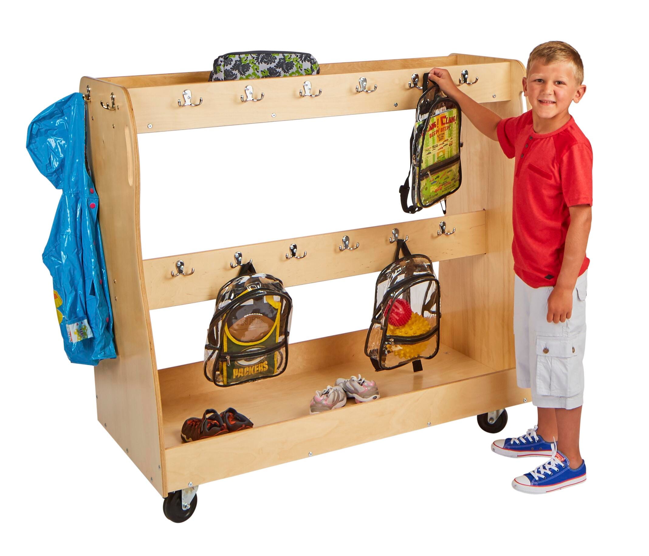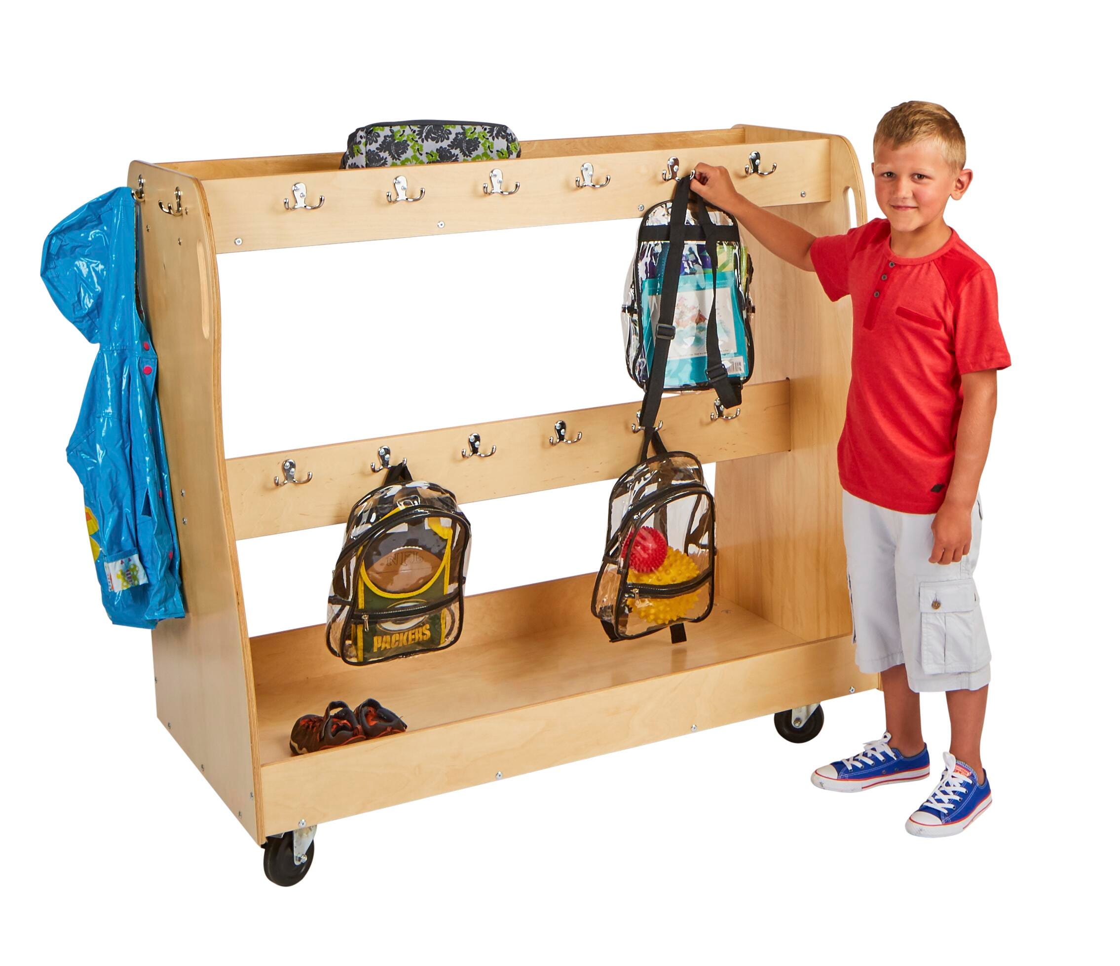 Keep backpacks, coats, and gear neatly organized with this mobile storage cart for classrooms.