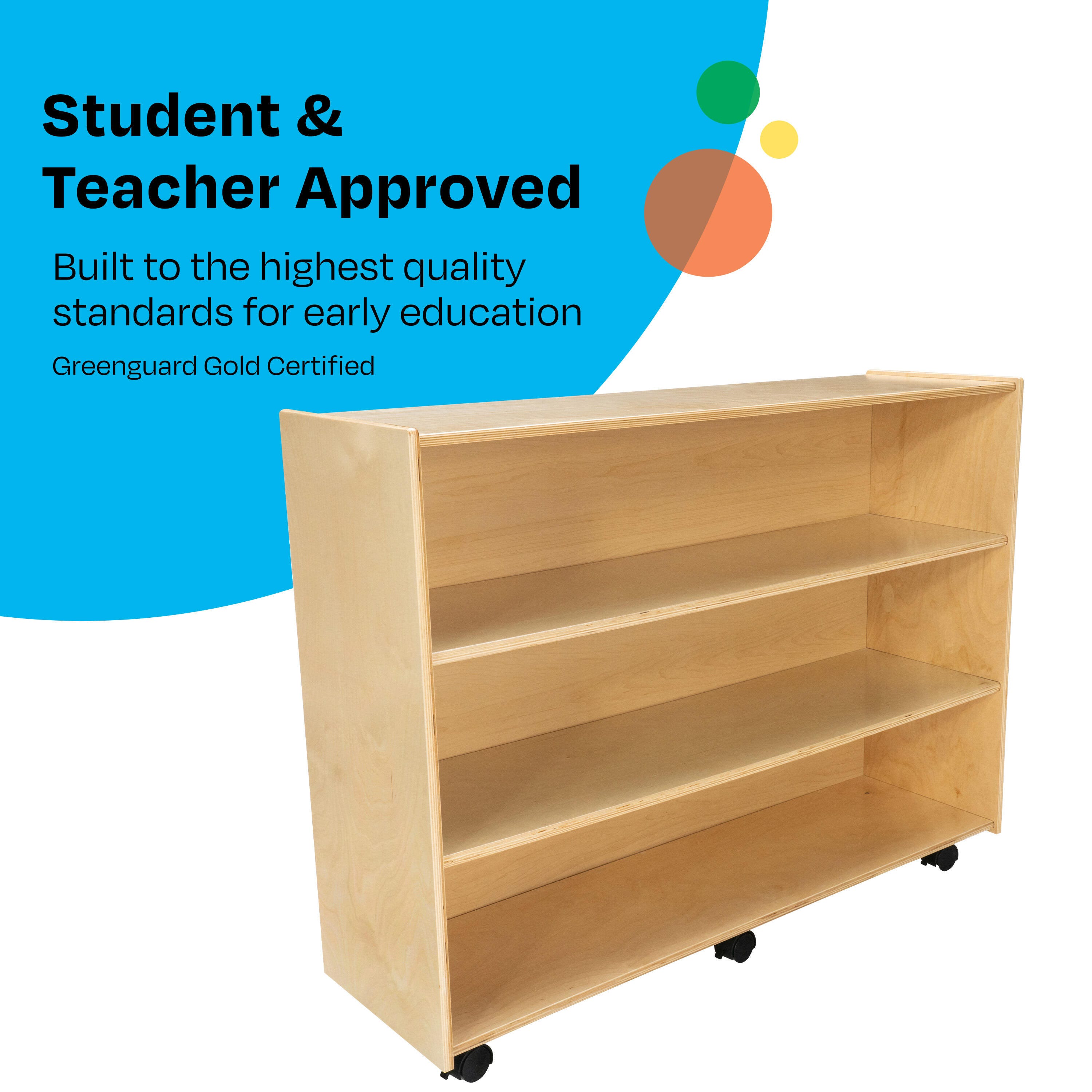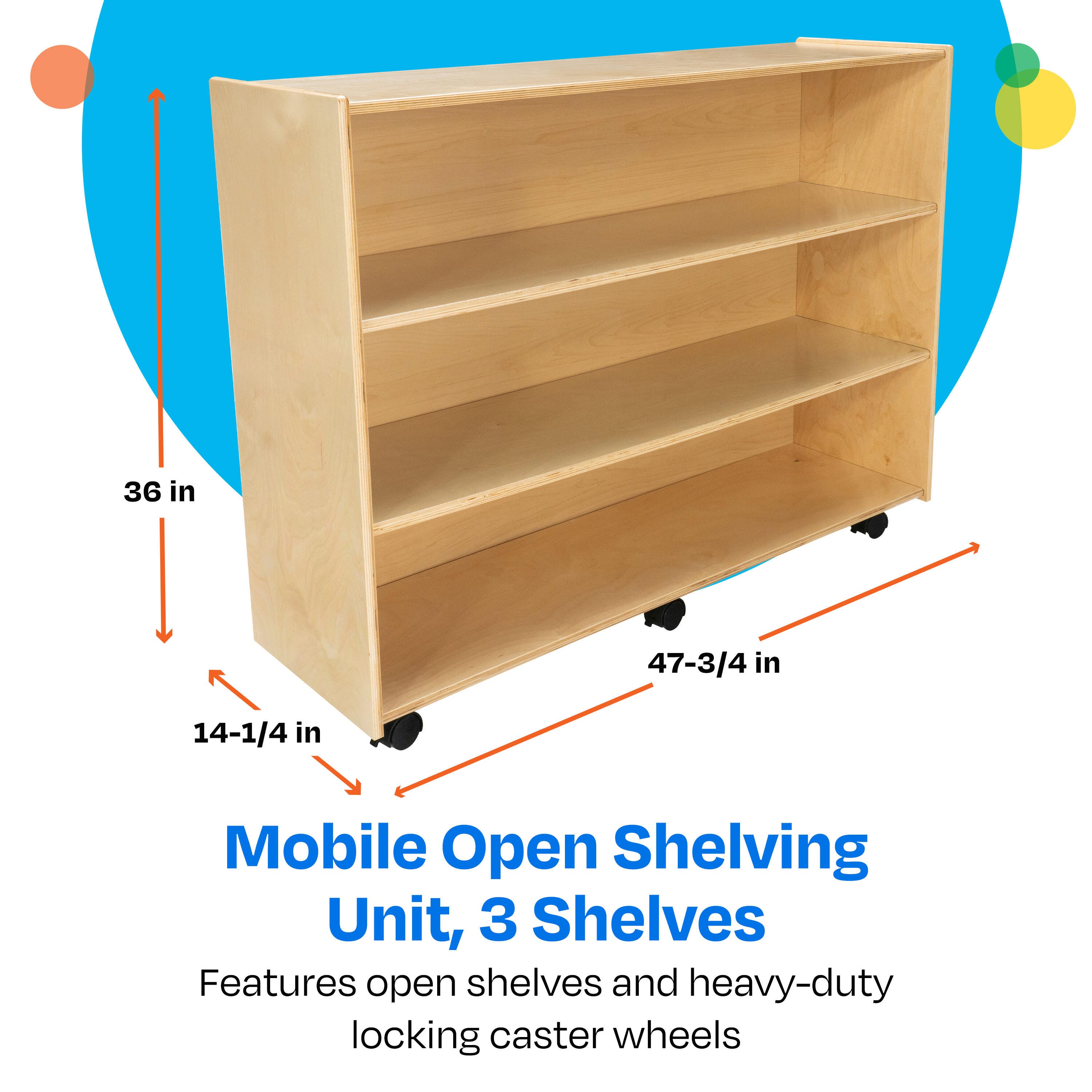Childcraft® Mobile Open Shelving Unit for Classrooms is easy to access for young children and is made with a durable design. Use the wooden shelf on wheels for preschool, kindergarten, daycare centers, homes, and beyond. The convenient storage shelves are great for storing and organizing books, blocks, games, and manipulatives, keeping them neat and accessible for students. Crafted for long-lasting use, this classroom furniture piece is made of durable birch plywood that’s easy to wipe clean. Comes fully assembled. This classroom bookcase measures 47-3/4 W x 14-1/4 D x 36 H inches.