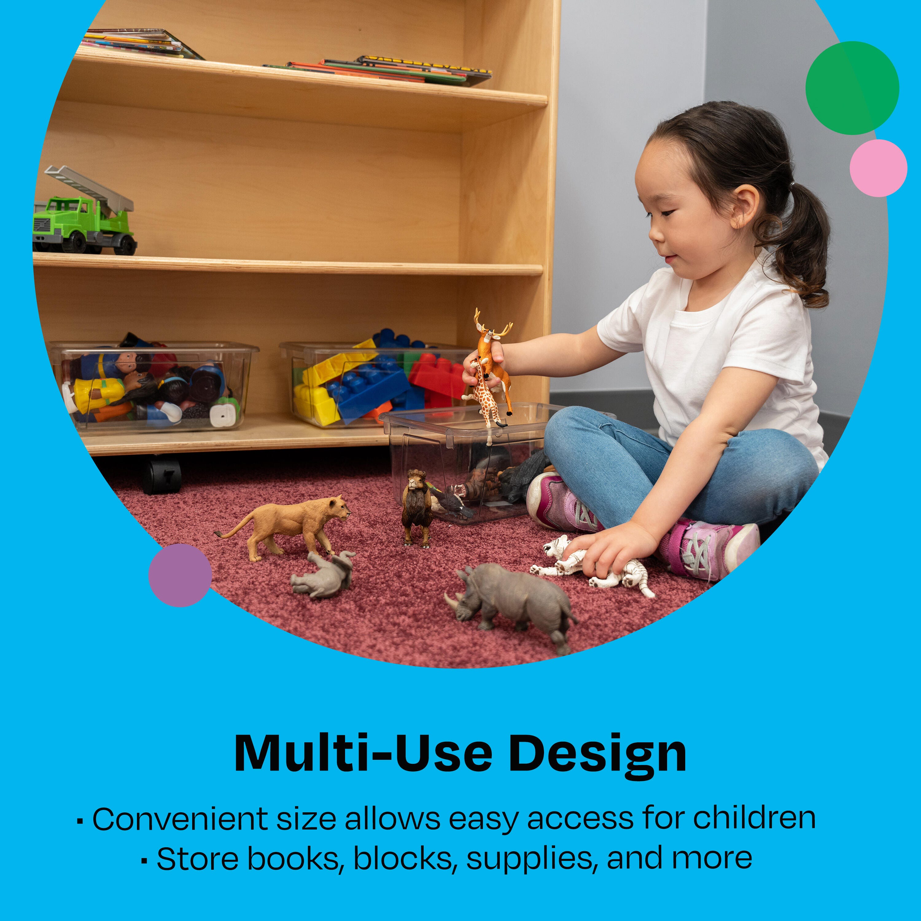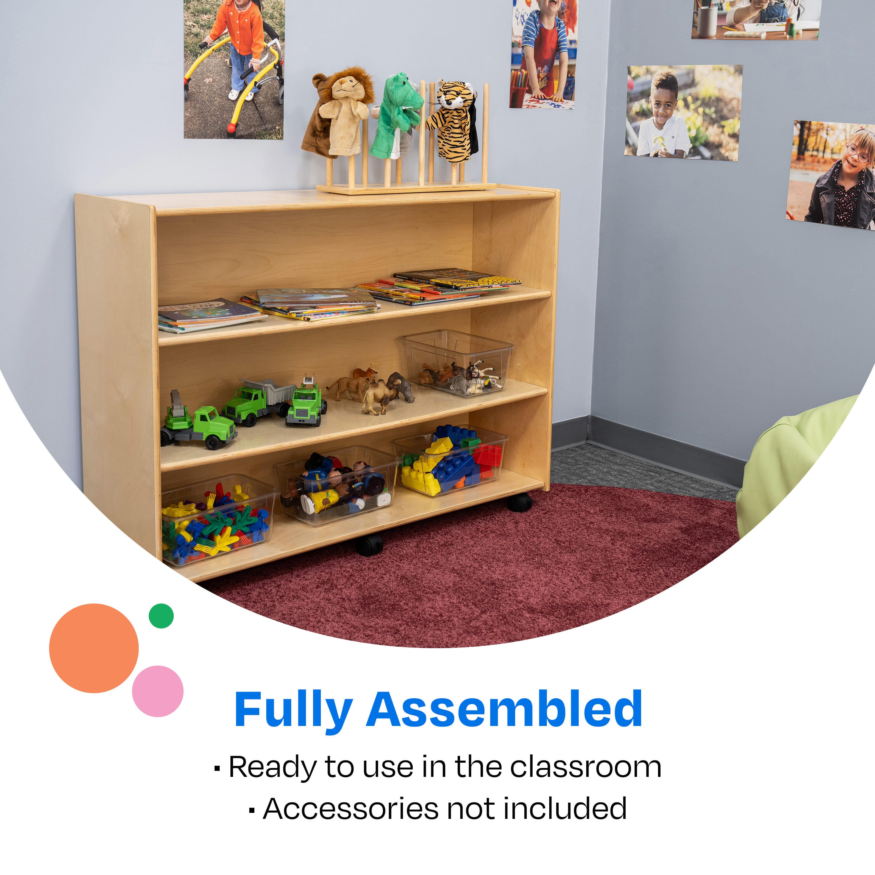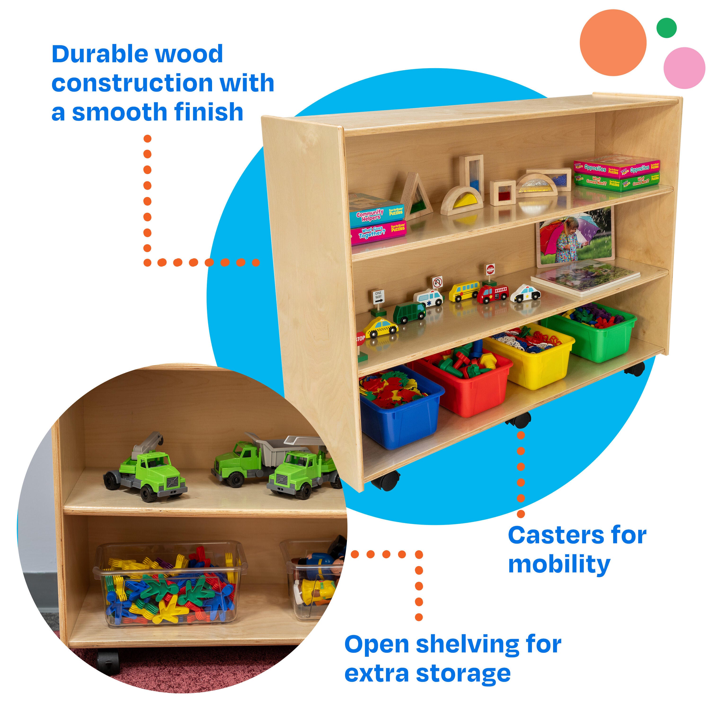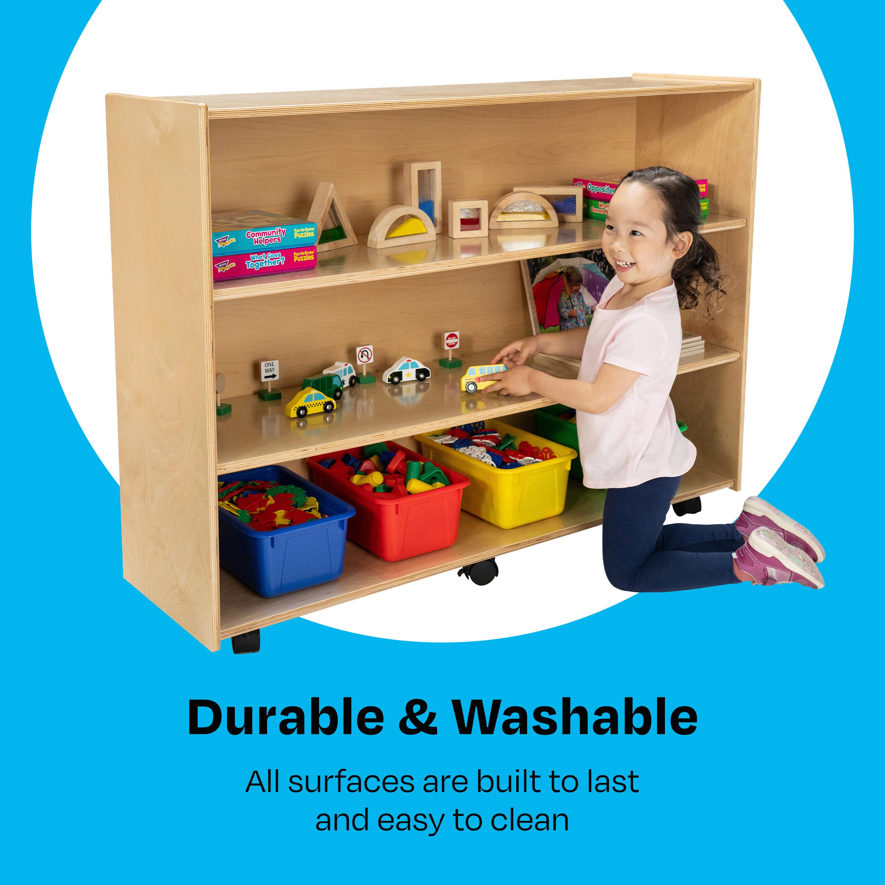 A convenient size allows children to have easy access to their favorite items, and the mobile bookcase is easy for adults to move from one area to another