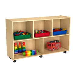 The Childcraft® Mobile Storage Unit with 5 openings, provides ample space for organizing supplies, books, games, bins, and more in classrooms, childcare centers, and homes. Featuring spacious openings, this bookcase also comes with heavy-duty caster wheels for effortless mobility around the room. Crafted from durable birch plywood with a beautiful natural veneer finish, this wooden bookcase is built to last. A convenient design makes it easy for children to access what they need. Measures 47-3/4 W x 14-1/4 D x 30 H inches. Comes fully assembled.Features